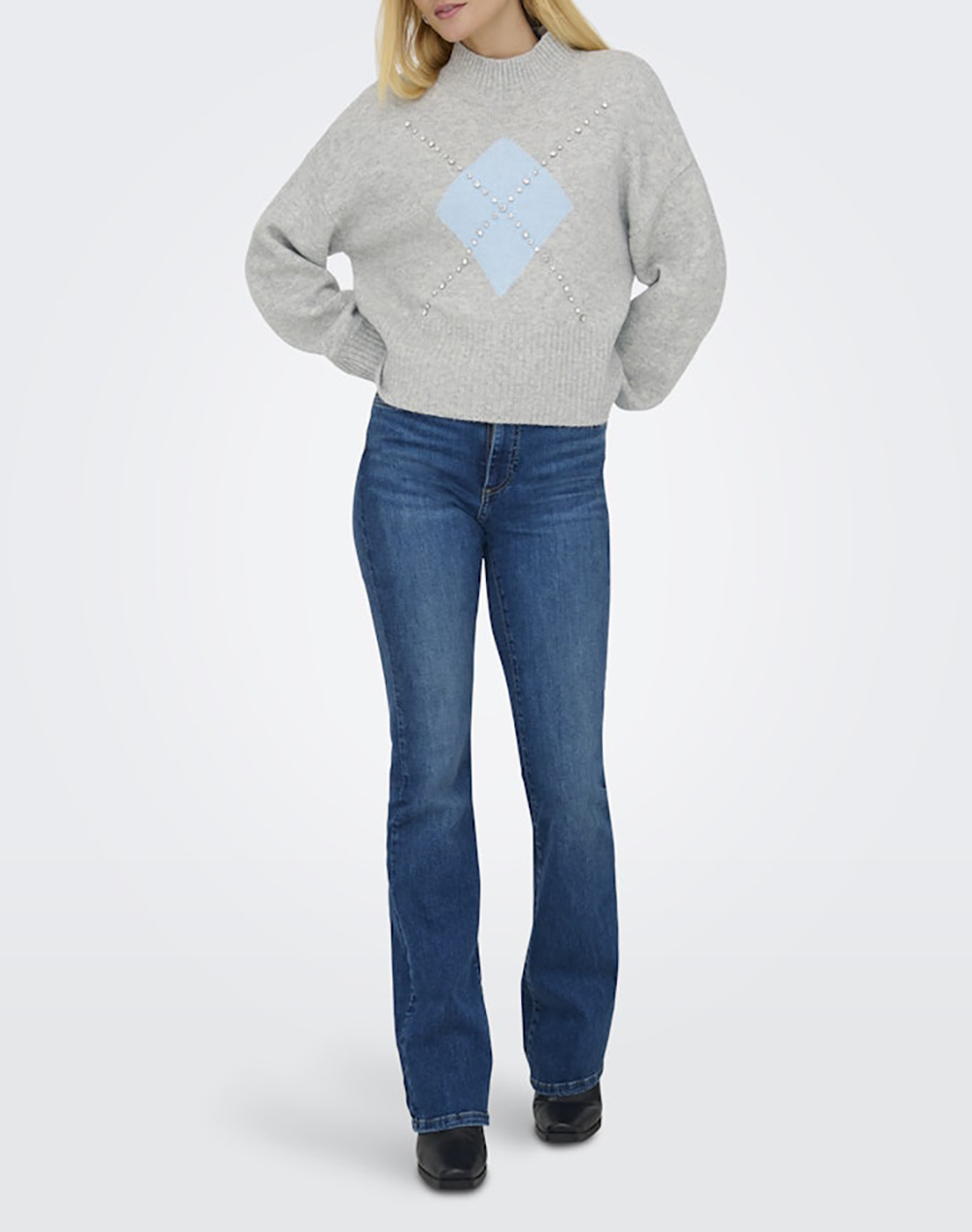 Γυναικείο πουλόβερ, σε κανονική γραμμή, μακρυμάνικο, με σχέδιο μπροστά, λεπτομέρειες με στράς και ψηλή λαιμόκοψη.(Σύνθεση: 63% Ανακυκλωμένος Πολυεστέρας, 33% Ακρυλικό, 4% Ελαστάνη)
