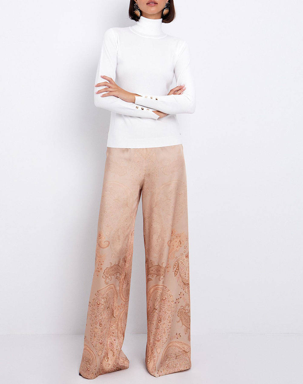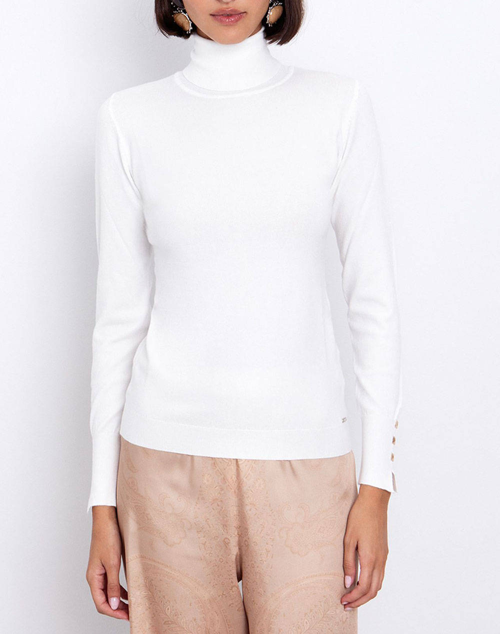Γυναικεία πλεκτή μπλούζα, σε κανονική γραμμή, μονόχρωμη, με μακριά μανίκια με χρυσές λεπτομέρειες, ζιβάγκο και ριμπ τελειώματα. (Σύνθεση: 56% Βισκόζη, 28% Πολυεστέρας, 16% Πολυαμίδιο)