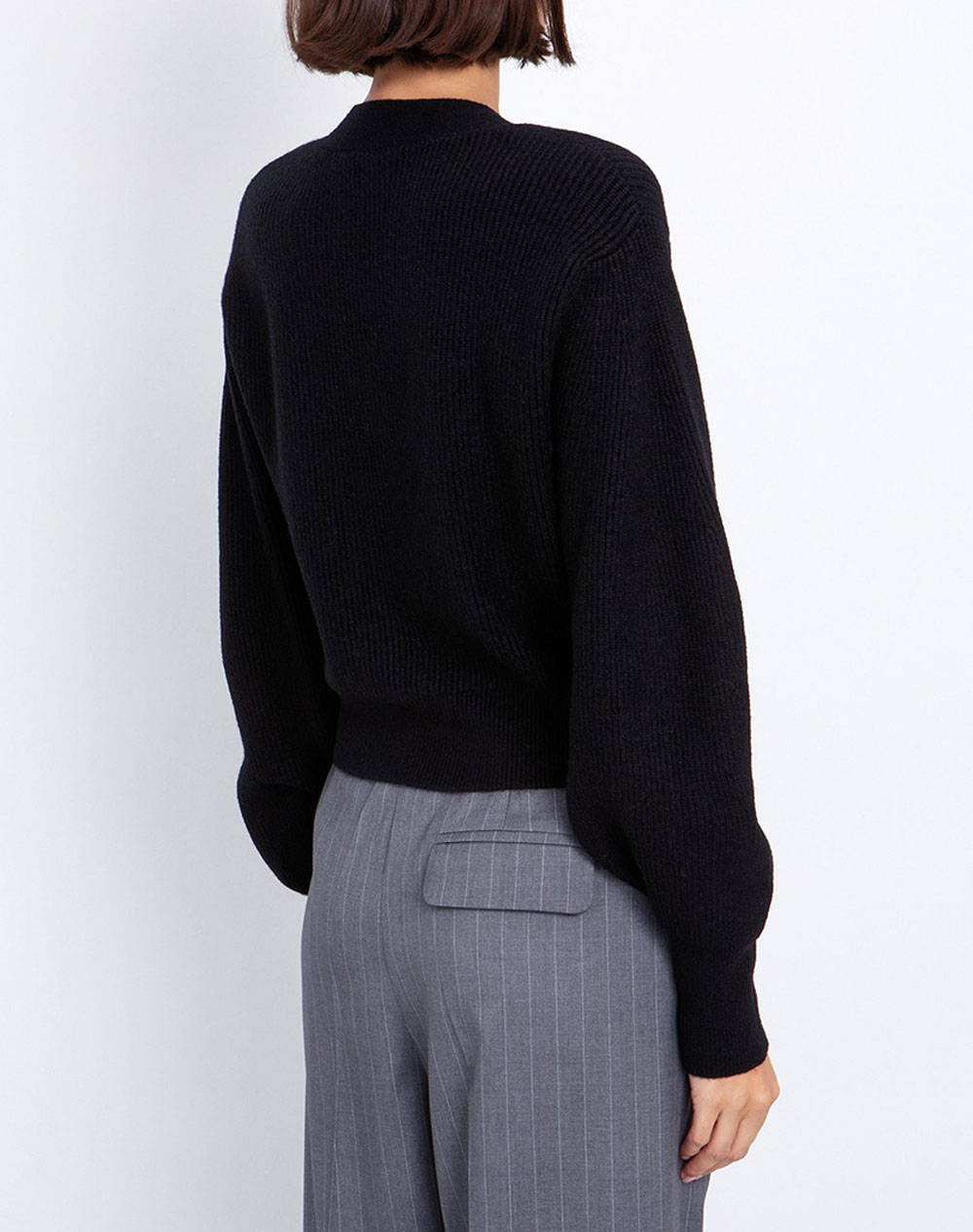 Γυναικεία πλεκτή ζακέτα, σε άνετη γραμμή, μονόχρωμη, μακρυμάνικη, με "V"λαιμόκοψη, φουσκωτά μανίκια και κλείσιμο μπροστά με κουμπιά. (Σύνθεση: 56% Βισκόζη, 28% Πολυεστέρας, 16% Πολυαμίδιο)