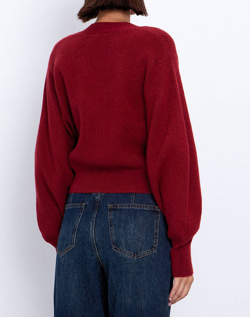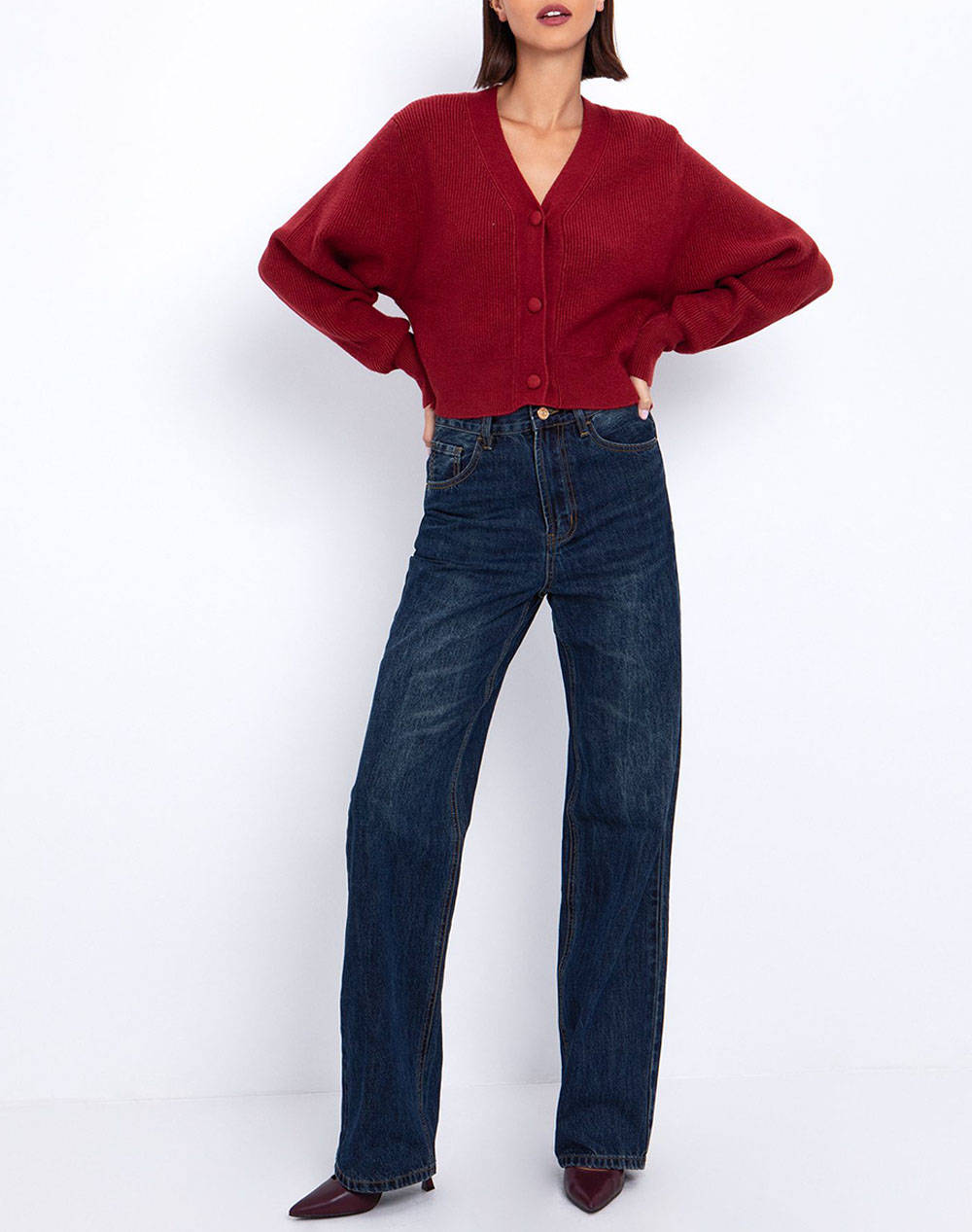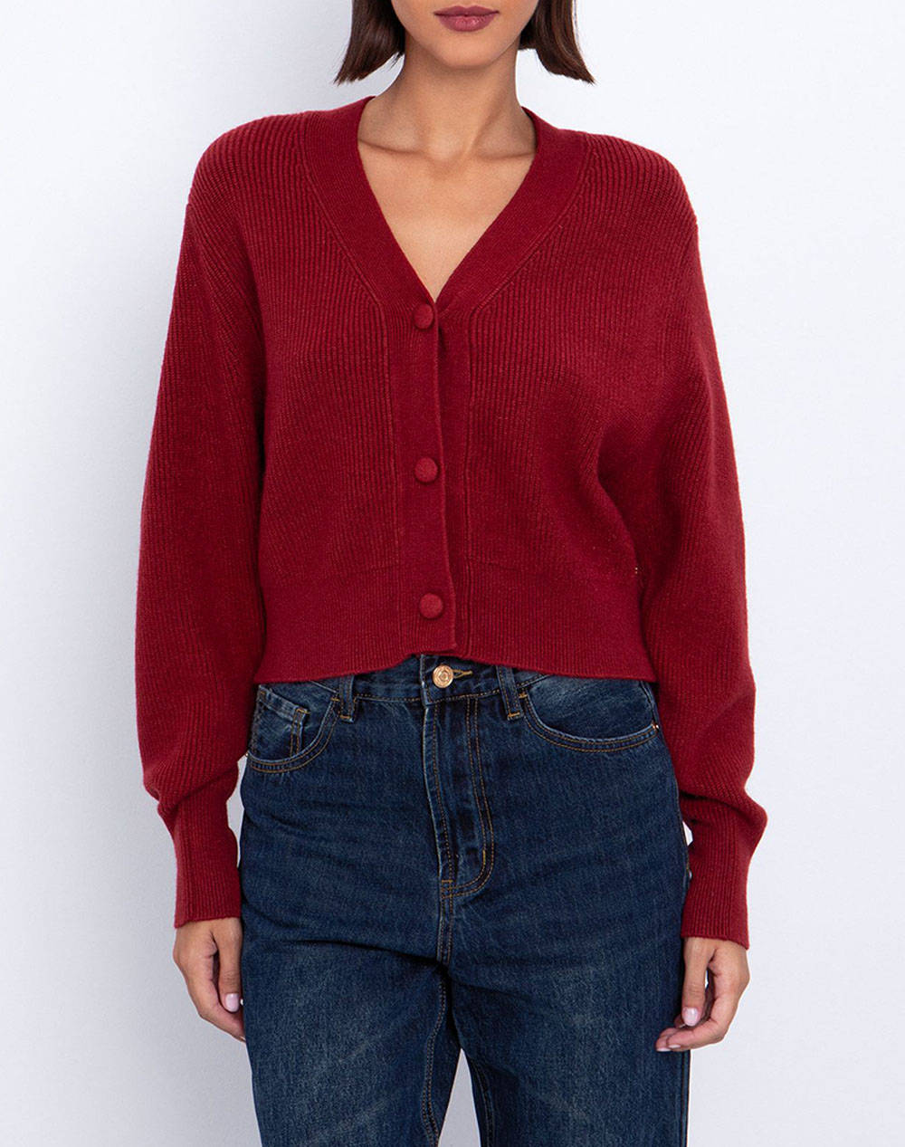Γυναικεία πλεκτή ζακέτα, σε άνετη γραμμή, μονόχρωμη, μακρυμάνικη, με "V"λαιμόκοψη, φουσκωτά μανίκια και κλείσιμο μπροστά με κουμπιά. (Σύνθεση: 56% Βισκόζη, 28% Πολυεστέρας, 16% Πολυαμίδιο)