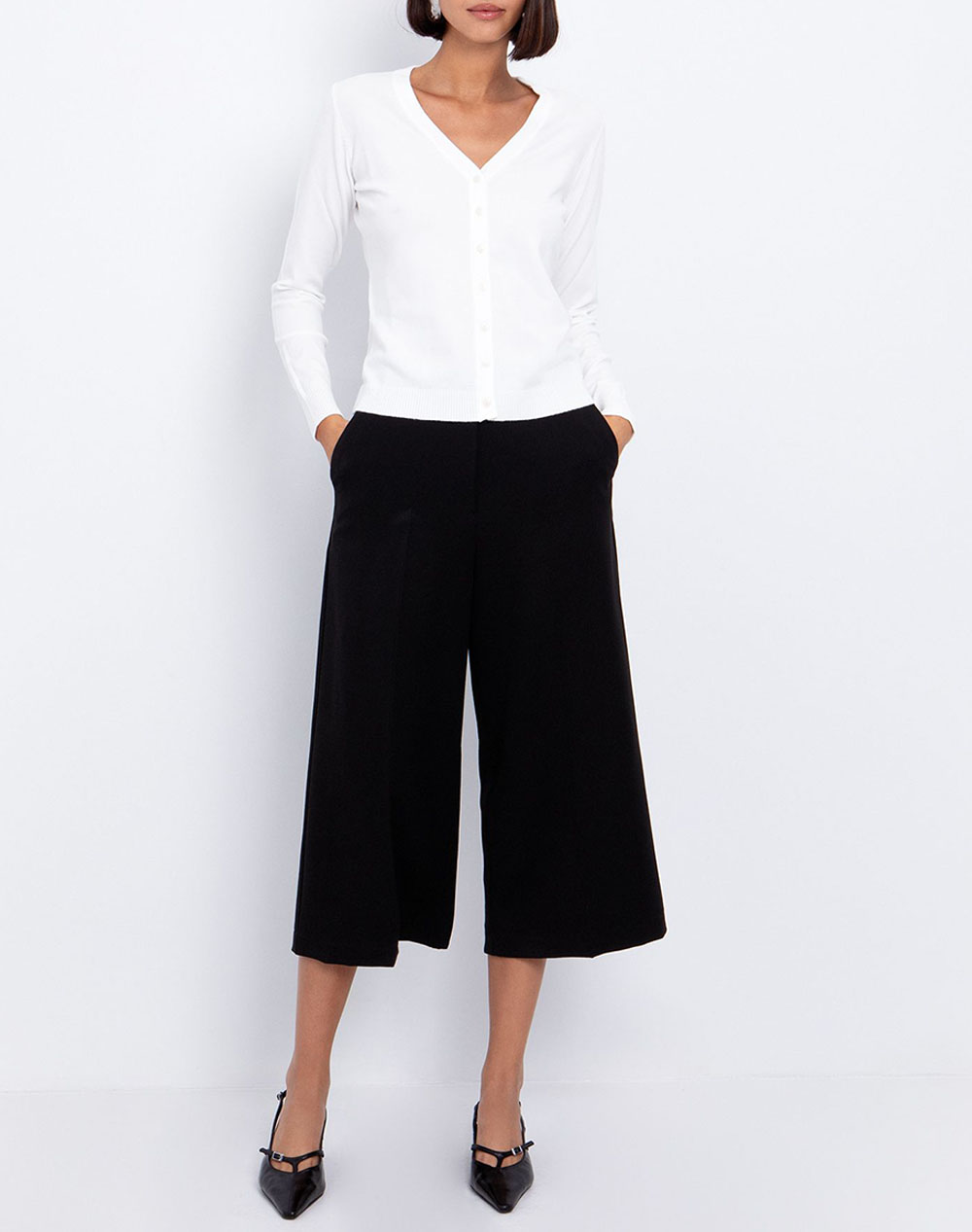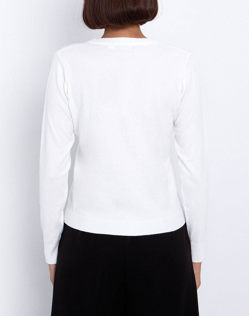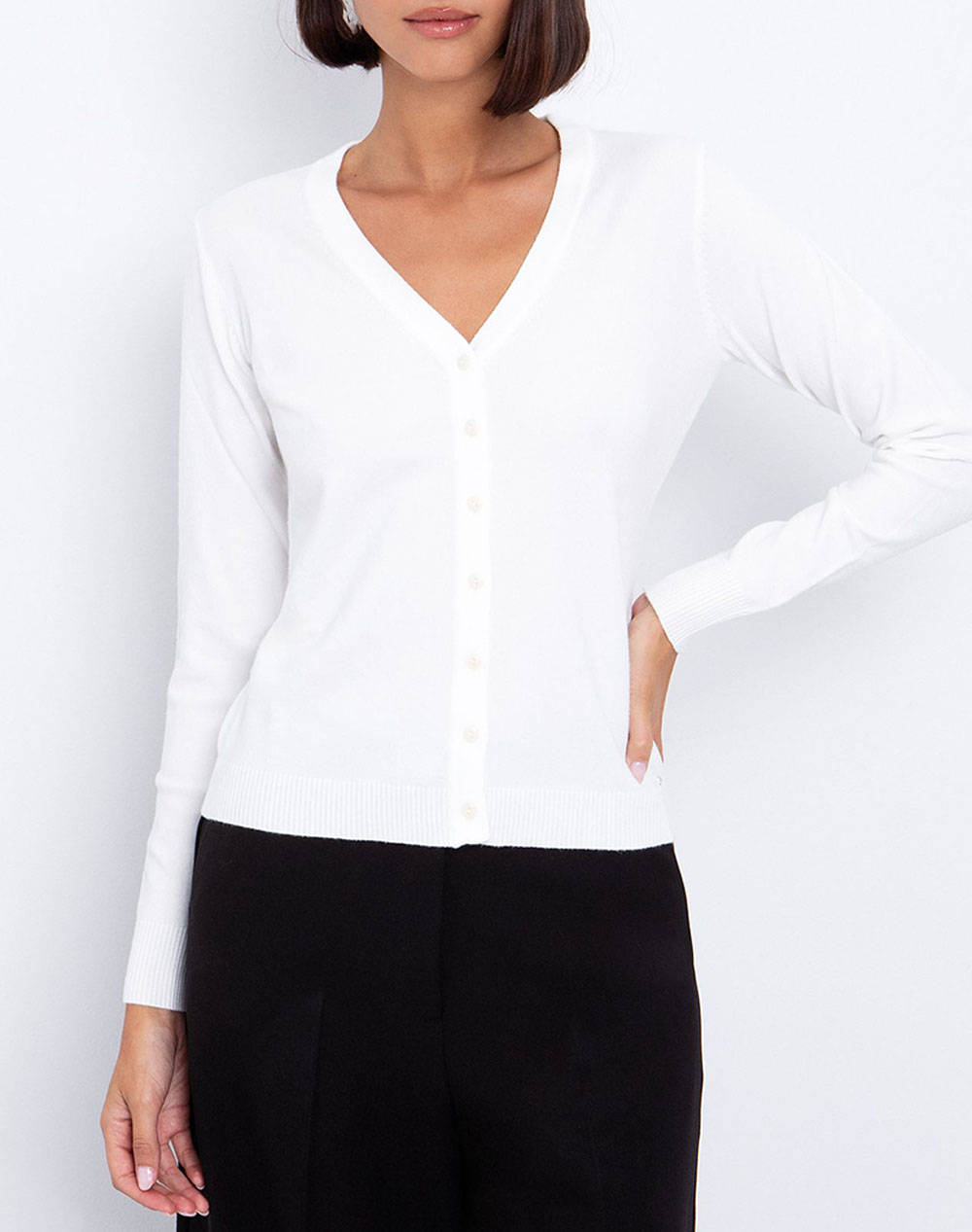 Γυναικεία πλεκτή ζακέτα, σε κανονική γραμμή, μονόχρωμη, μακρυμάνικη, με "V"λαιμόκοψη και κλείσιμο μπροστά με κουμπιά. (Σύνθεση: 56% Βισκόζη, 28% Πολυεστέρας, 16% Πολυαμίδιο)