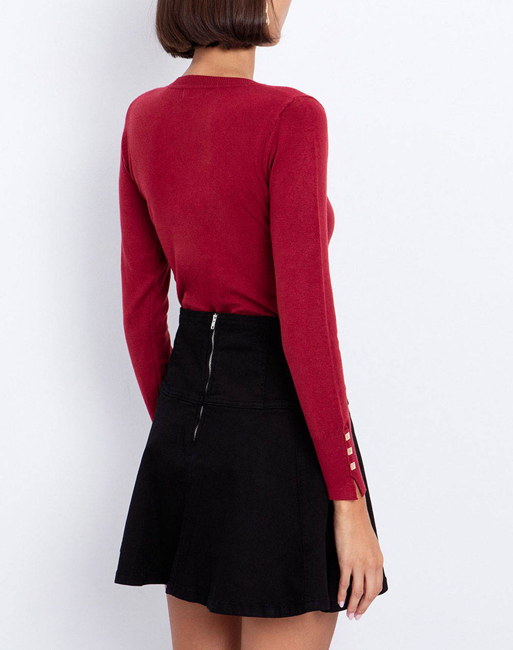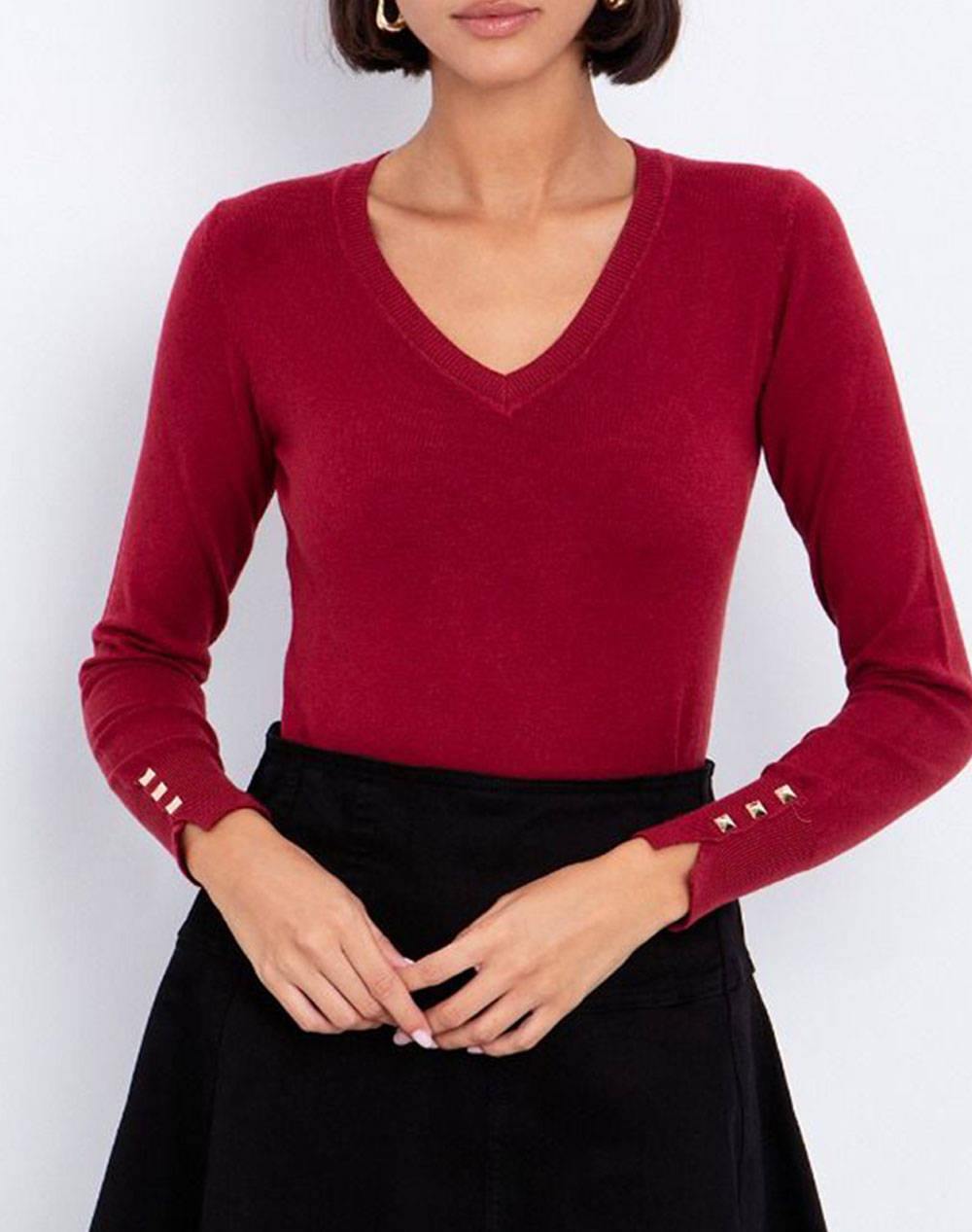 Γυναικεία μπλούζα, σε κανονική γραμμή, μονόχρωμη, μακρυμάνικη, σε λεπτή πλέξη, με "V"λαιμόκοψη, χρυσές λεπτομέρειες και μικρό άνοιγμα στα μανίκια και ριμπ τελειώματα. (Σύνθεση: 56% Βισκόζη, 28% Πολυεστέρας, 16% Πολυαμίδιο)