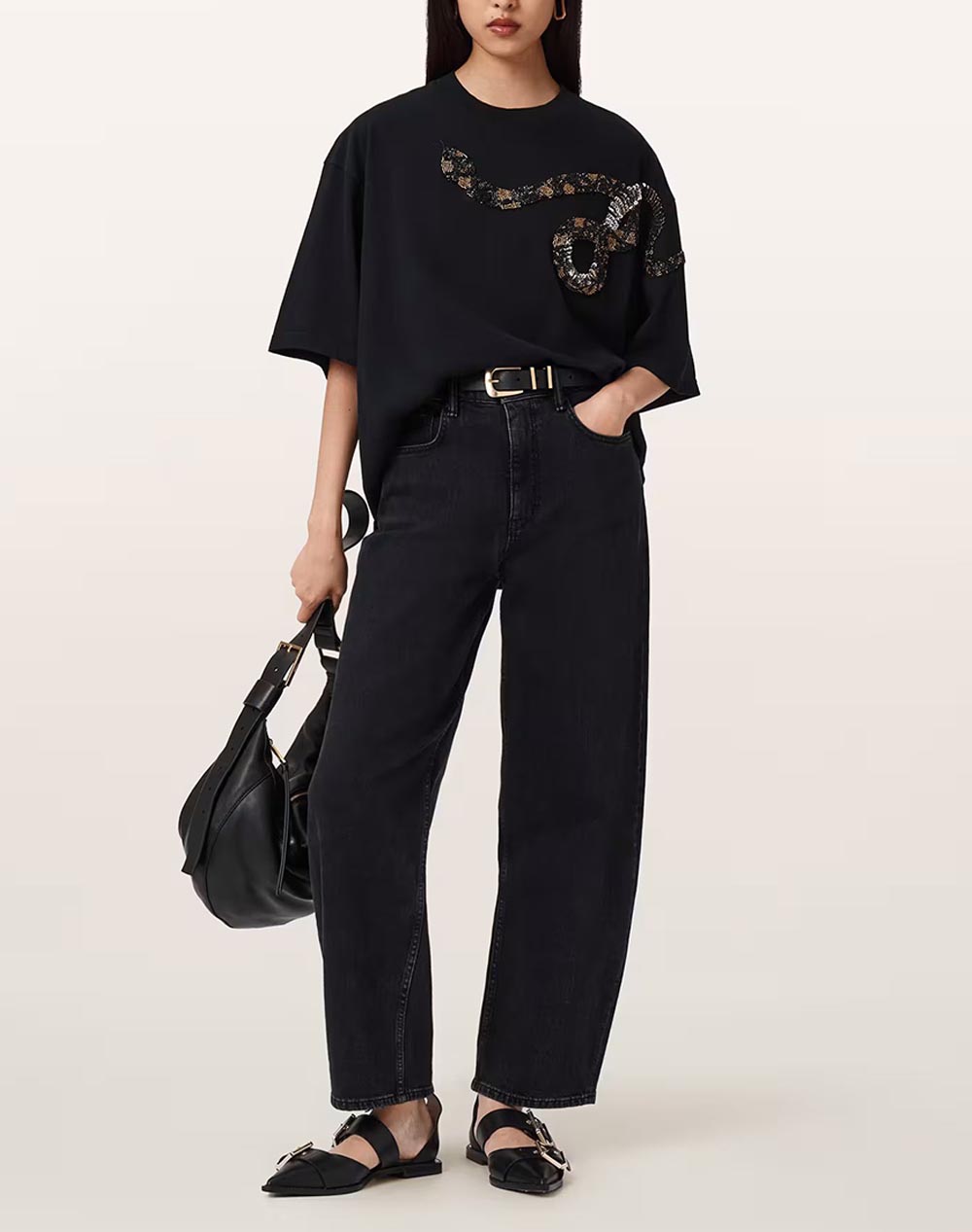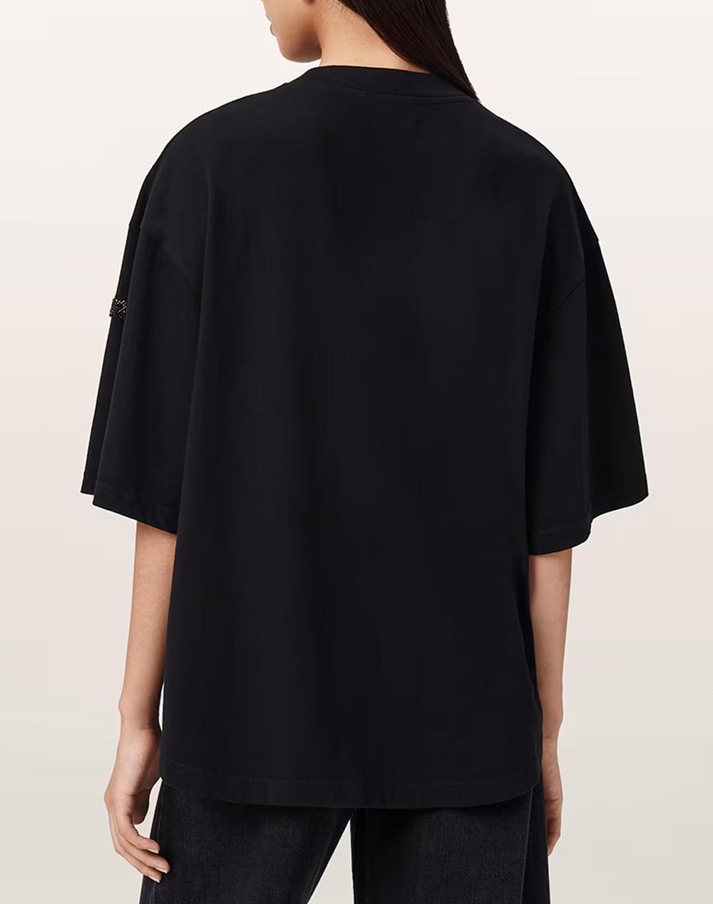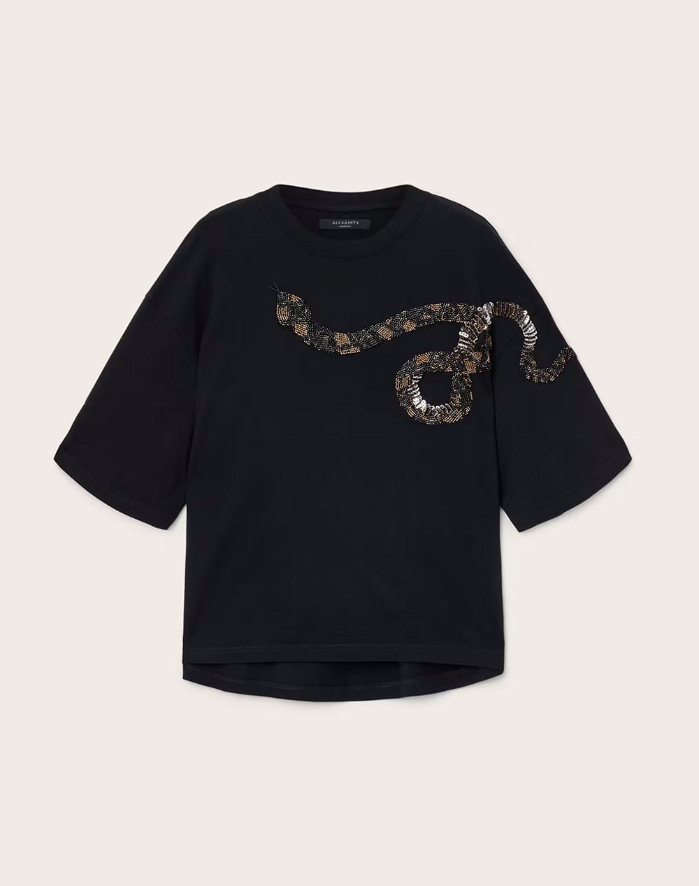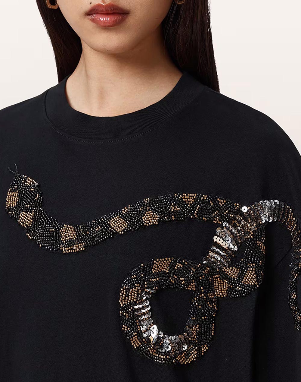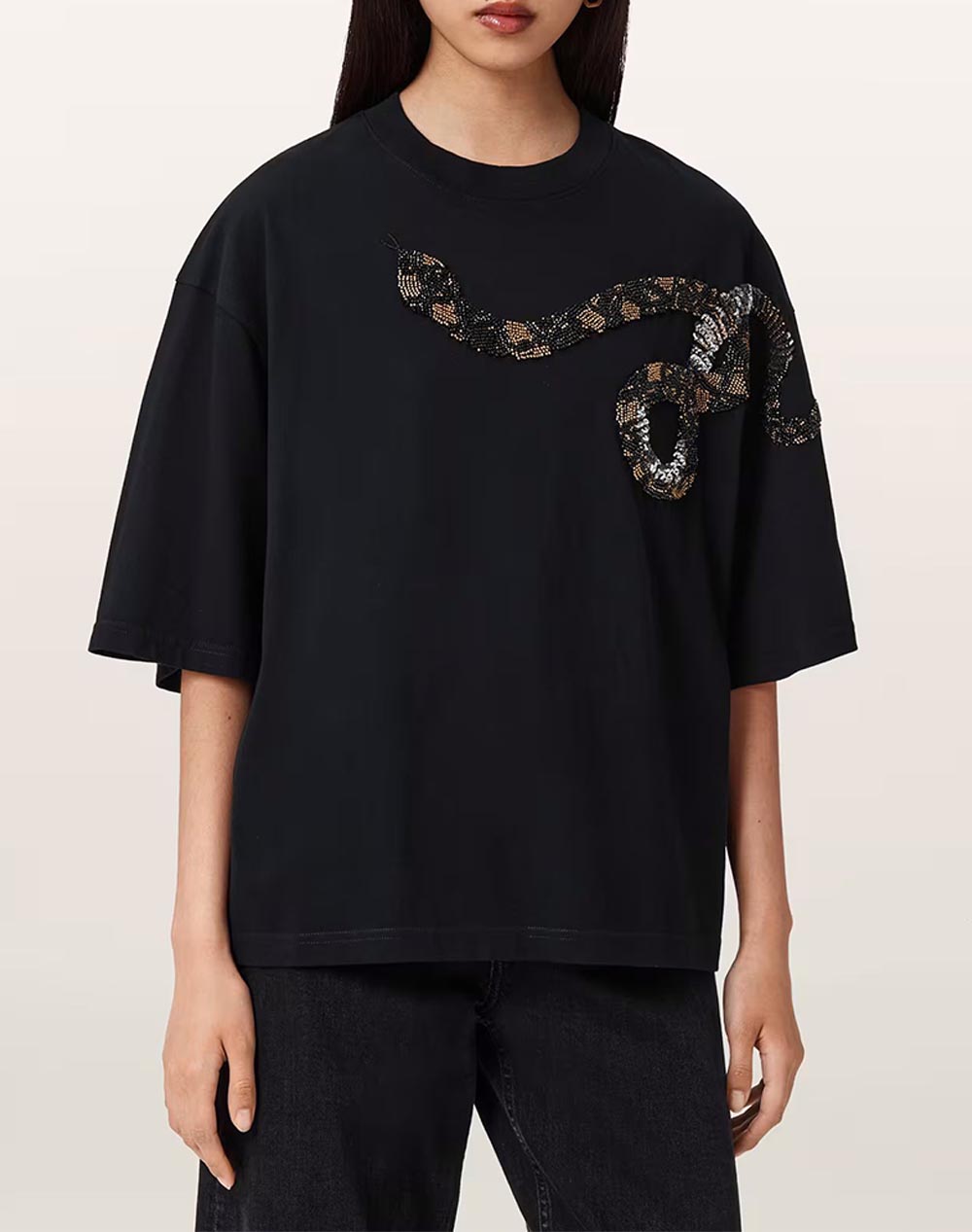 Γυναικεία μπλούζα t-shirt, σε χαλαρή γραμμή, κοντομάνικη, με στρογγυλή λαιμόκοψη και λεπτομέρεια strass snake σχέδιο. (Σύνθεση: 100% Βαμβάκι)
