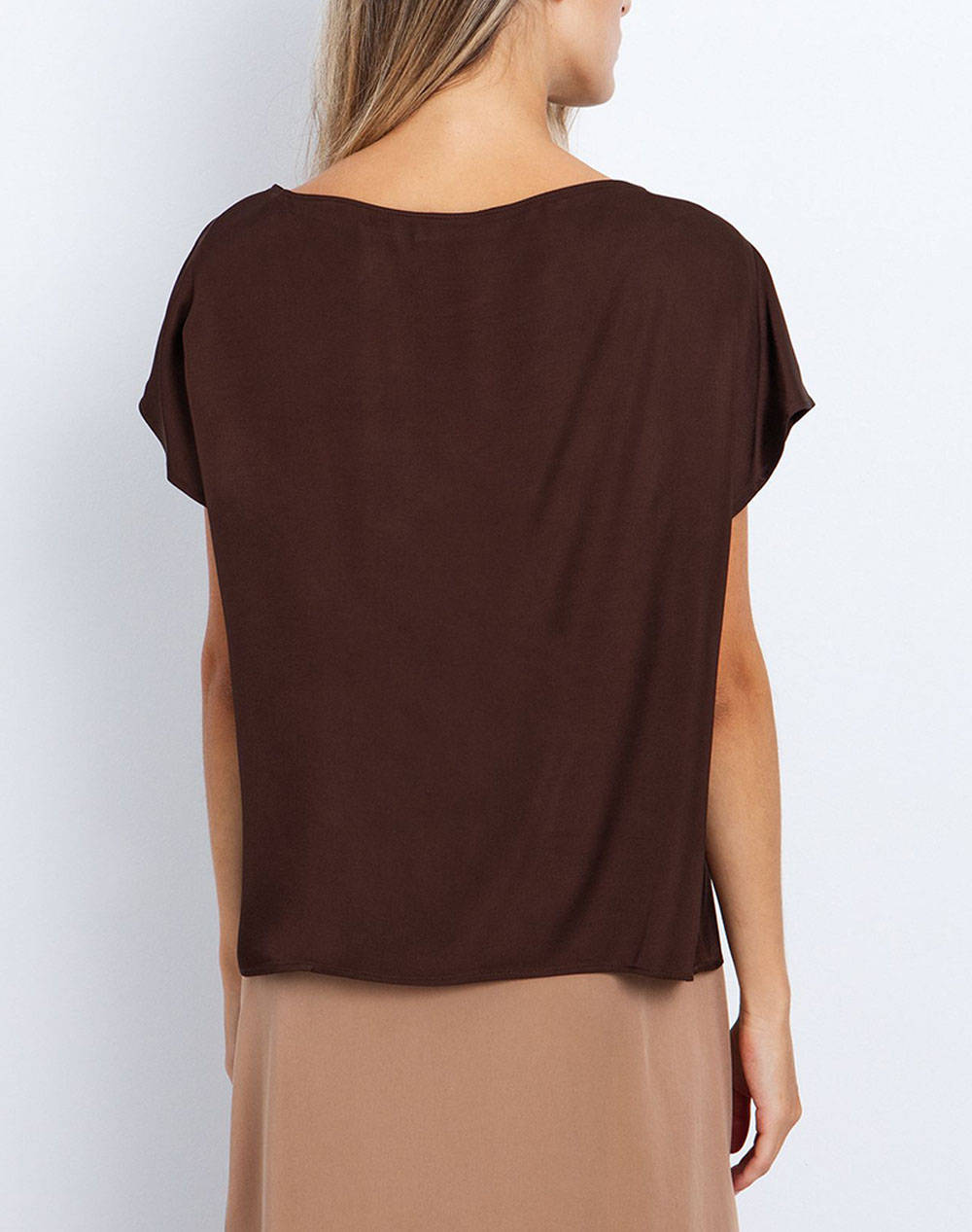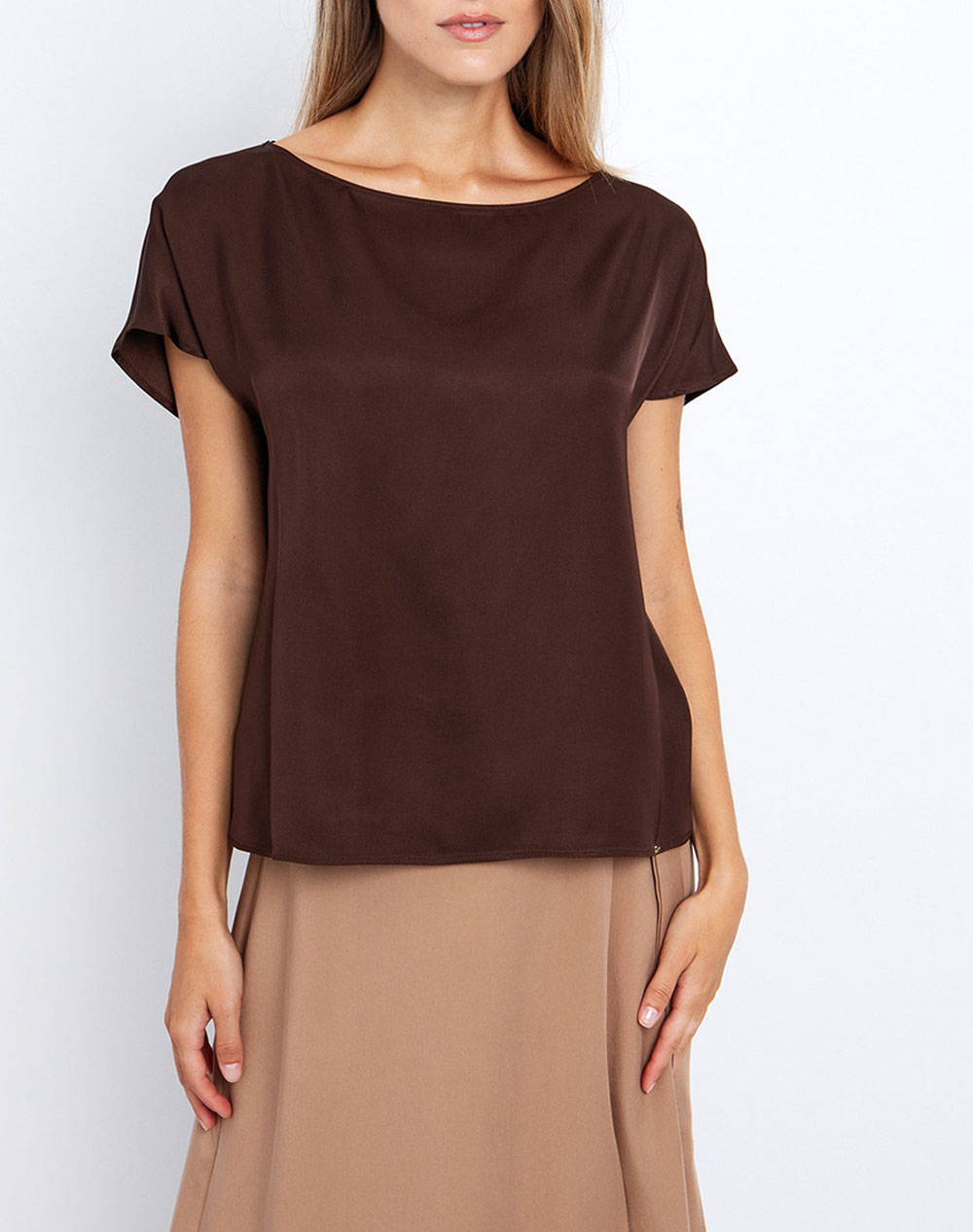 Γυναικεία μπλούζα, μονόχρωμη, κοντομάνικη, με σατινέ ύφη και στρογγυλή λαιμόκοψη. (Σύνθεση: 100% Βισκόζη)