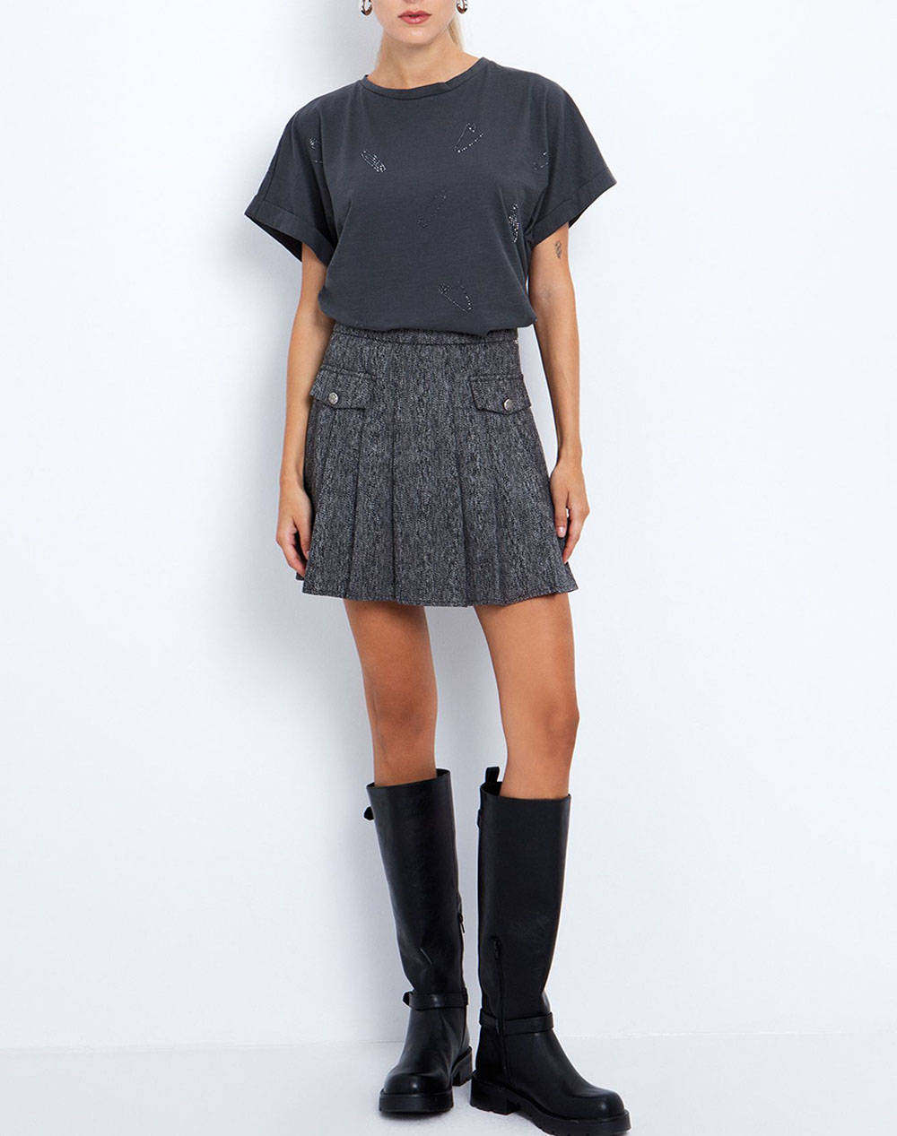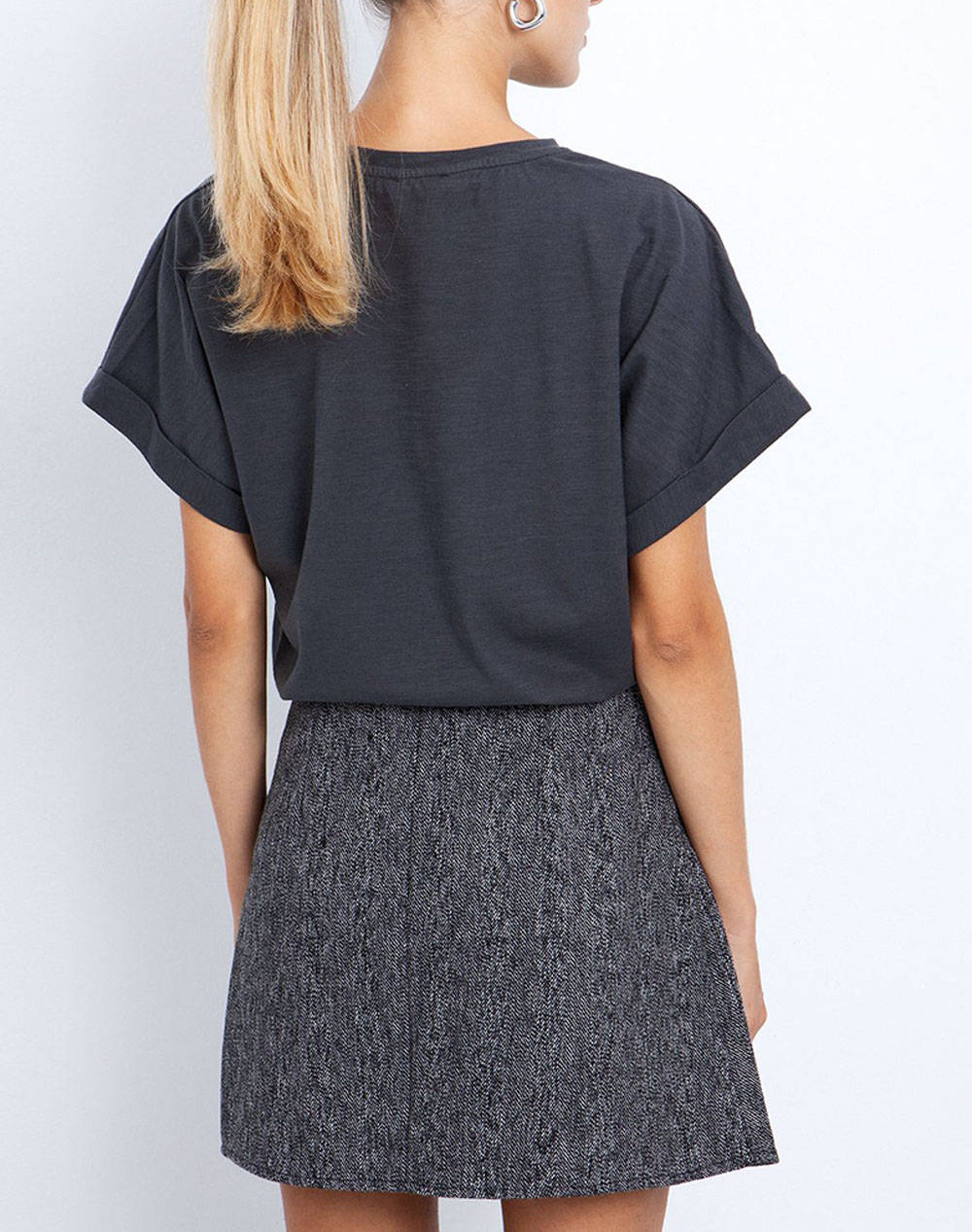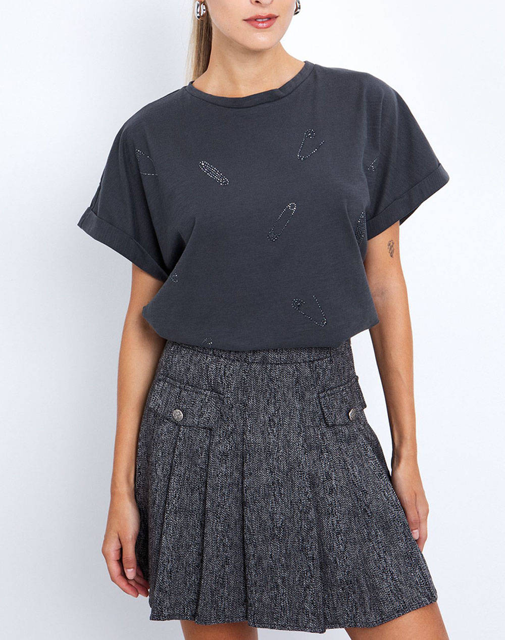 Γυναικεία μπλούζα, σε άνετη γραμμή, μονόχρωμη, κοντομάνικη, με διακοσμητικά στράς και στρογγυλή λαιμόκοψη. (Σύνθεση: 100% Βαμβάκι)