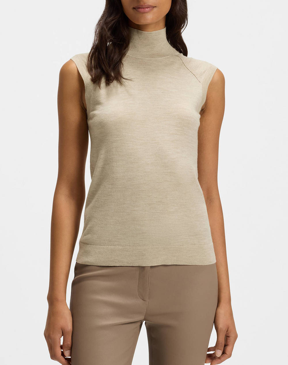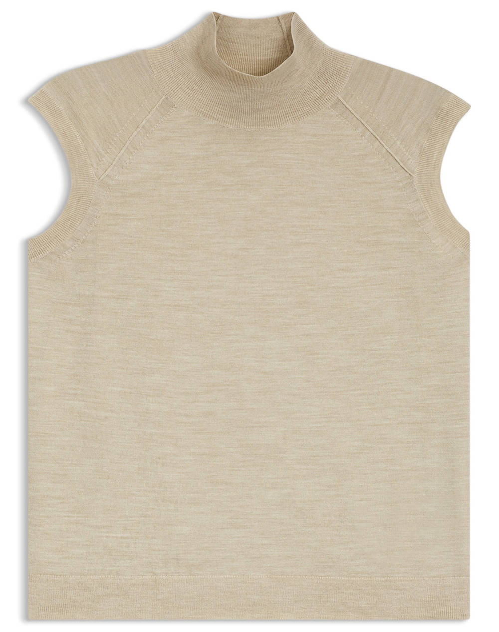 Γυναικείο πλεκτό τοπ, σε κανονική γραμμή, αμάνικο και με ψηλή rib λαιμόκοψη. (Σύνθεση: 100% Φυσικό μαλλί)