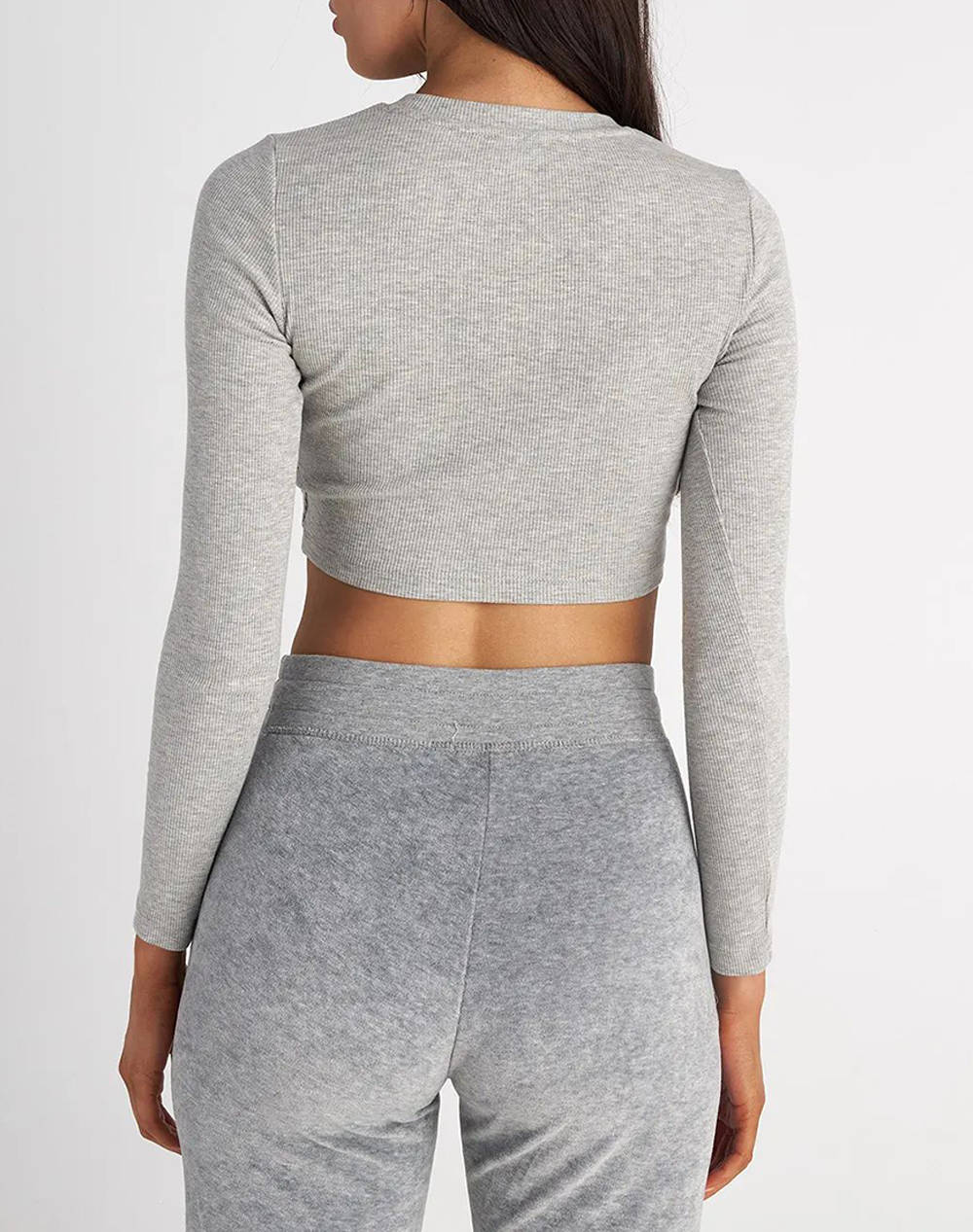 Γυναικεία κοντή μπλούζα, σε στενή γραμμή, μονόχρωμη, μακρυμάνικη, με ριμπ ύφανση και στρογγυλή λαιμόκοψη. (Σύνθεση: 95% Βαμβάκι, 5% Ελαστάνη)