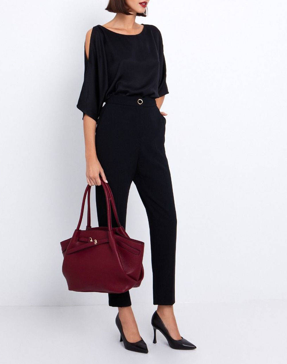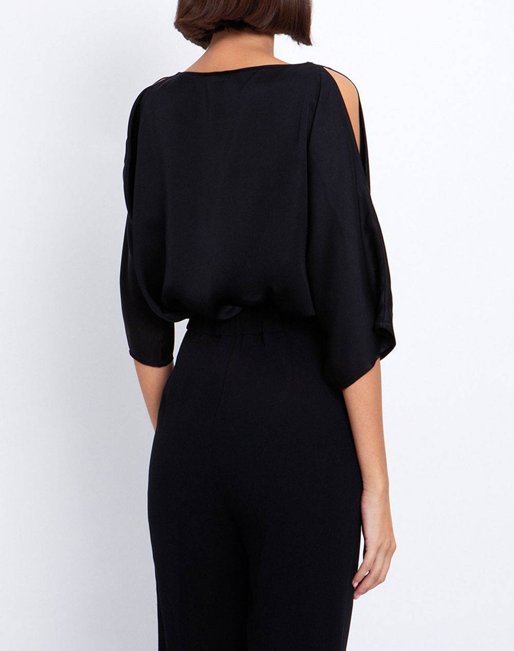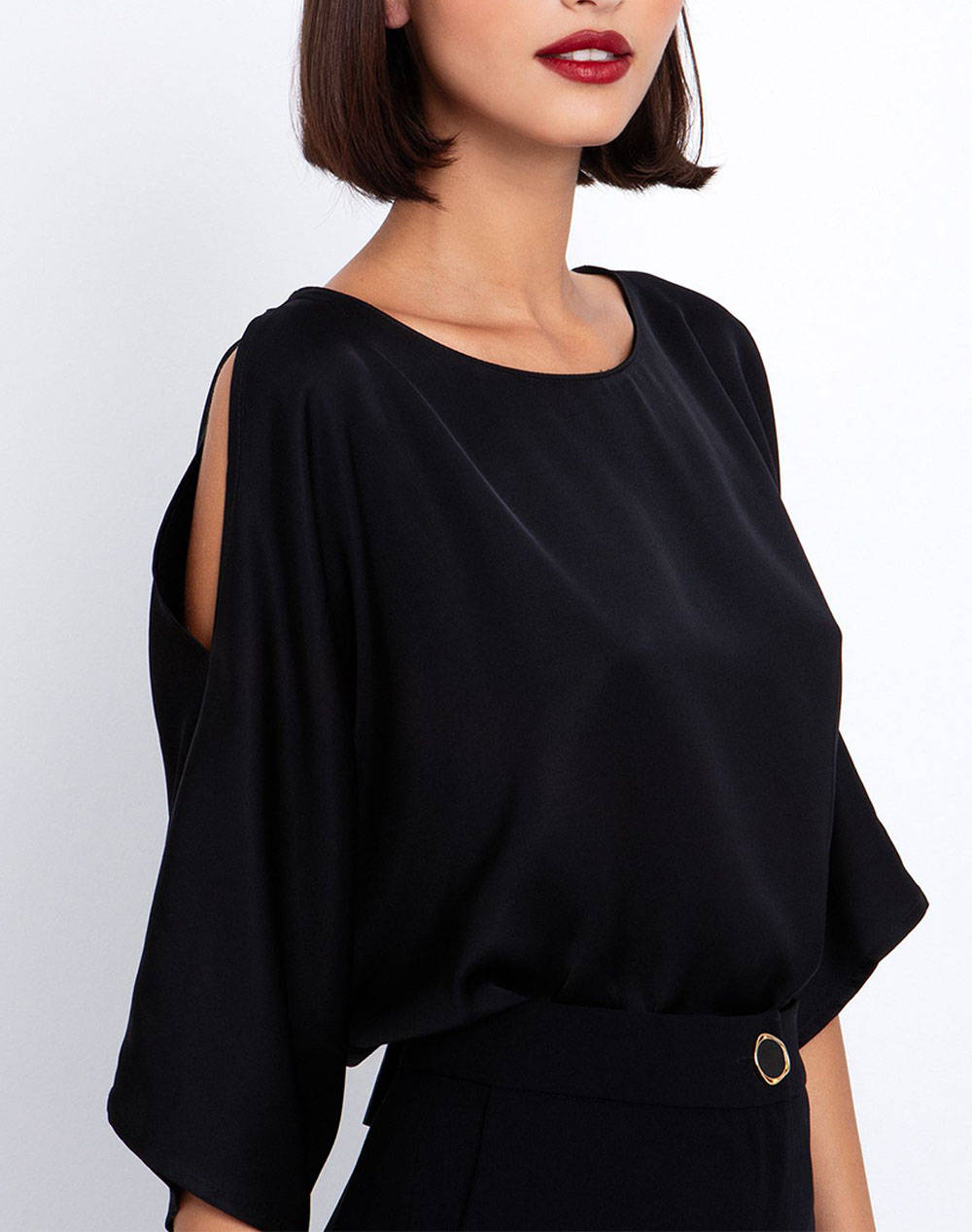 Γυναικεία μπλούζα, σε κανονική γραμμή, μονόχρωμη, με μανίκια 3/4, με cut out λεπτομέρειες, σατινέ υφή και στρογγυλή λαιμόκοψη. (Σύνθεση: 100% Βισκόζη)