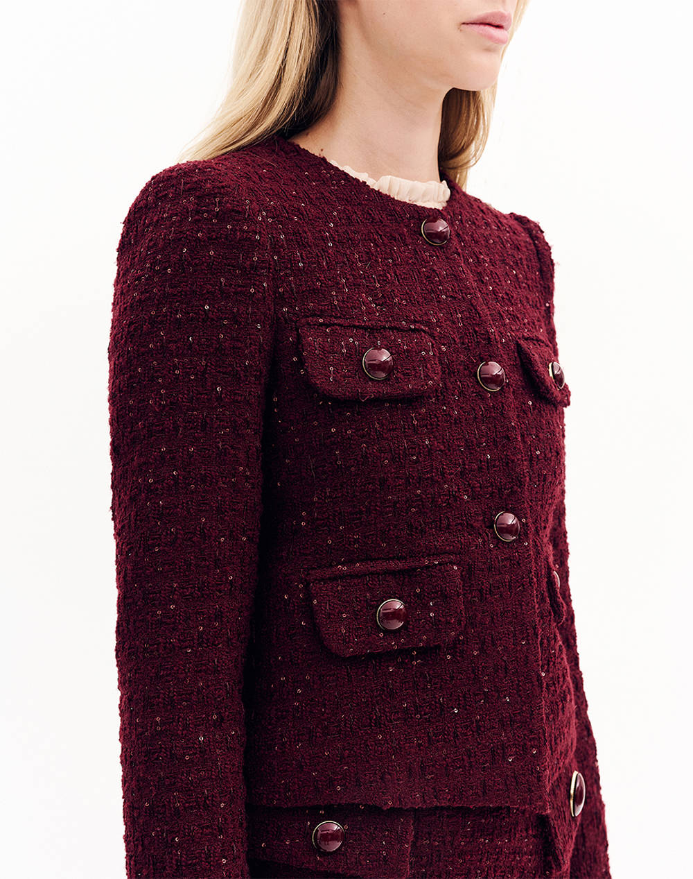Γυναικείο tweed σακάκι, με στρογγυλή λαιμόκοψη, με παγιέτα στην ύφανση και διακοσμητικές τσέπες με καπάκι. Κλείσιμο μπροστά με κουμπιά. (Σύνθεση: 80% Πολυεστέρας, 20% Μαλλί)