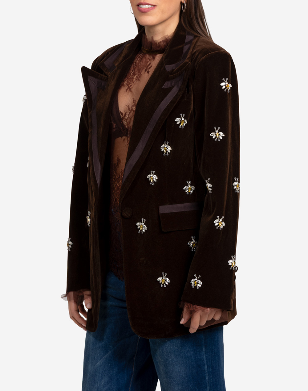 Γυναικείο blazer, σε γραμμή oversized, με γιακά πέτο, διακοσμητικές λεπτομέρειες με strass και κλείσιμο με κουμπί μπροστά. Διαστάσεις έως 120εκ. (Σύνθεση: Συνθετικό σουέτ)