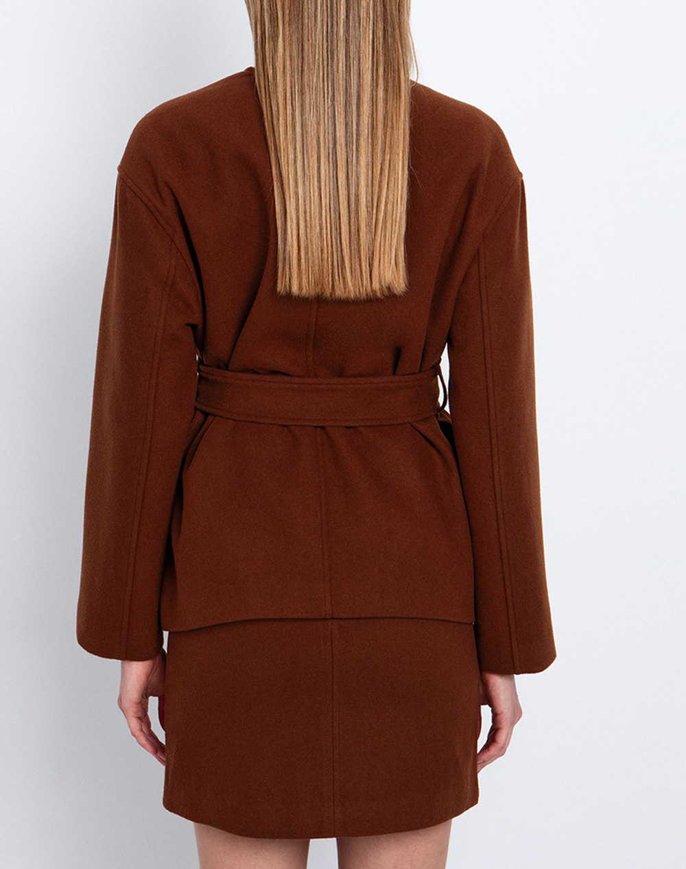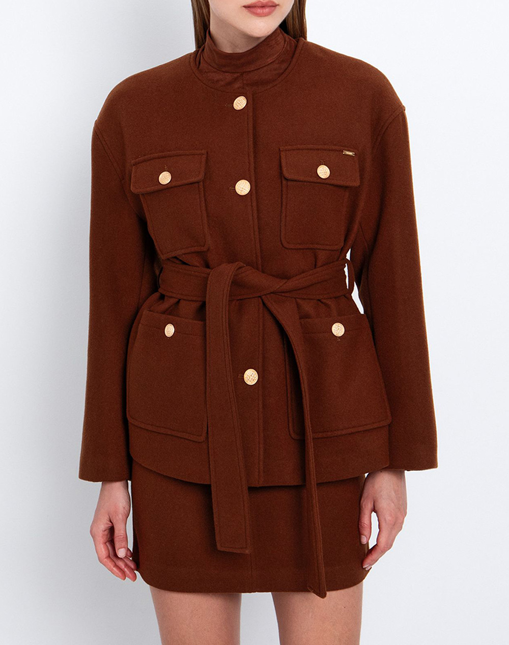 Γυναικείο τζάκετ, με στρογγυλή λαιμόκοψη, ζώνη στη μέση, μπροστινές τσέπες και κλείσιμο με μεταλλικά κουμπιά. (Σύνθεση: 60% Μαλλί, 40% Πολεστέρας)
