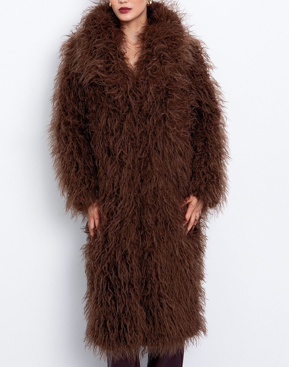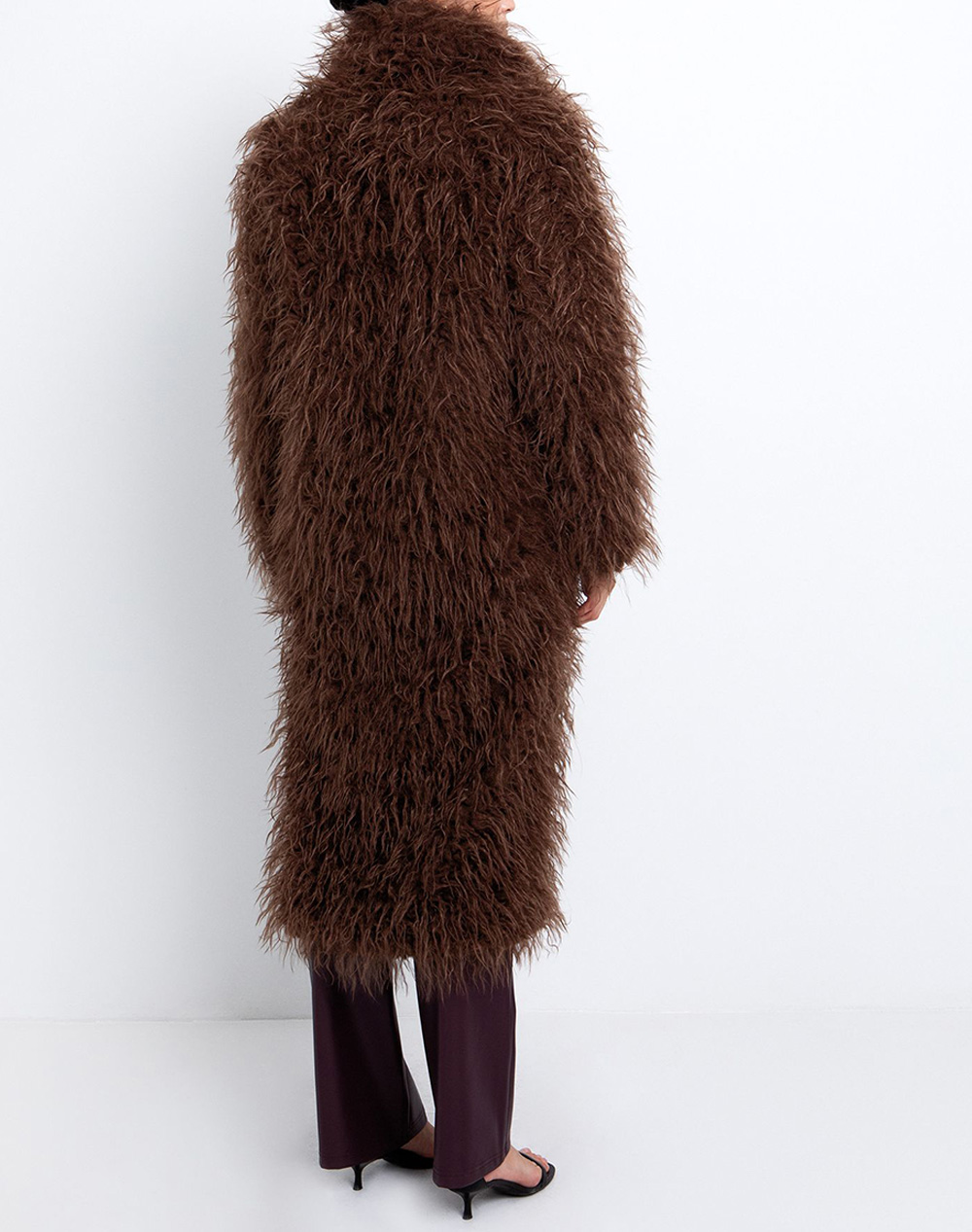Γυναικείο γούνινο παλτό, σε άνετη γραμμή, με φαρδύ πέτο και μπροστινό κλείσιμο με κουμπιά. (Σύνθεση: 100% Πολυεστέρας)