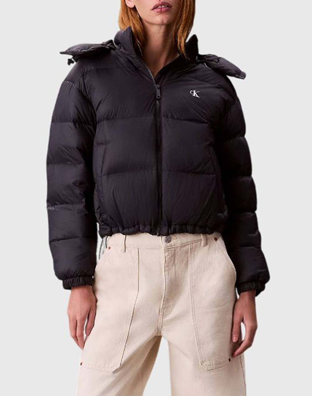 Γυναικείο κοντό μπουφάν puffer, αδιάβροχο, αντιανεμικό, σε φαρδιά γραμμή, με αποσπώμενη κουκούλα και κλείσιμο μπροστά με φερμουάρ. (Σύνθεση: 100% Νάιλον, Γέμιση: 70% Πούπουλο πάπιας 30% Φτερά)