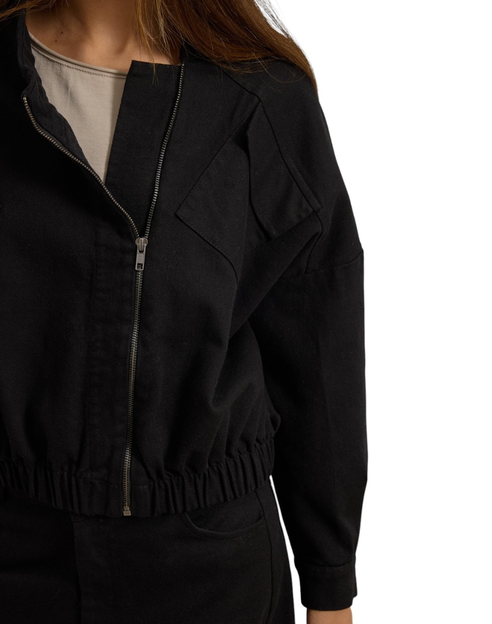 Γυναικείο τζάκετ, σε κανονική γραμμή, μακρυμάνικο, με μπροστινές τσέπες και λοξό κλείσιμο με φερμουάρ. (Σύνθεση: 100% Βαμβάκι)