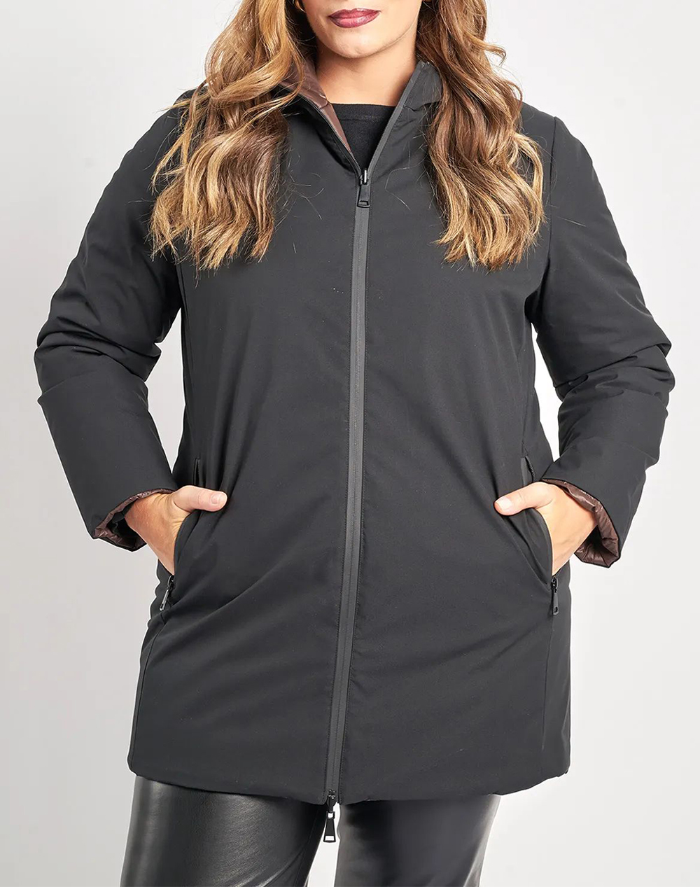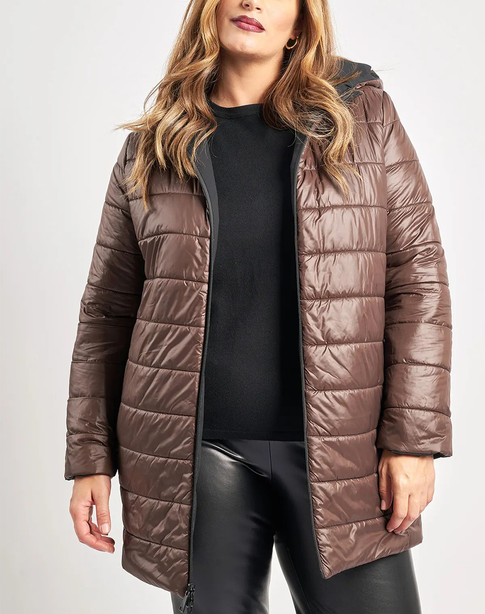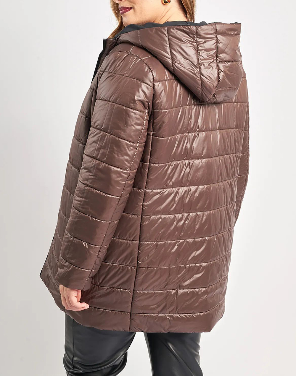 Γυναικείο μπουφάν, μακρυμάνικο, καπιτονέ, διπλής όψης, με κουκούλα, τσέπες στο πλάι και κλείσιμο με φερμουάρ.(Σύνθεση: 100% Πολυεστέρας)