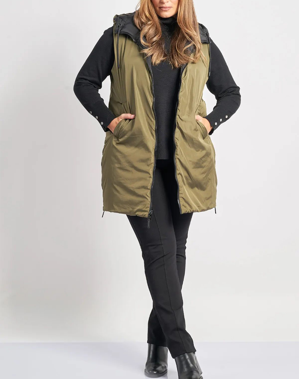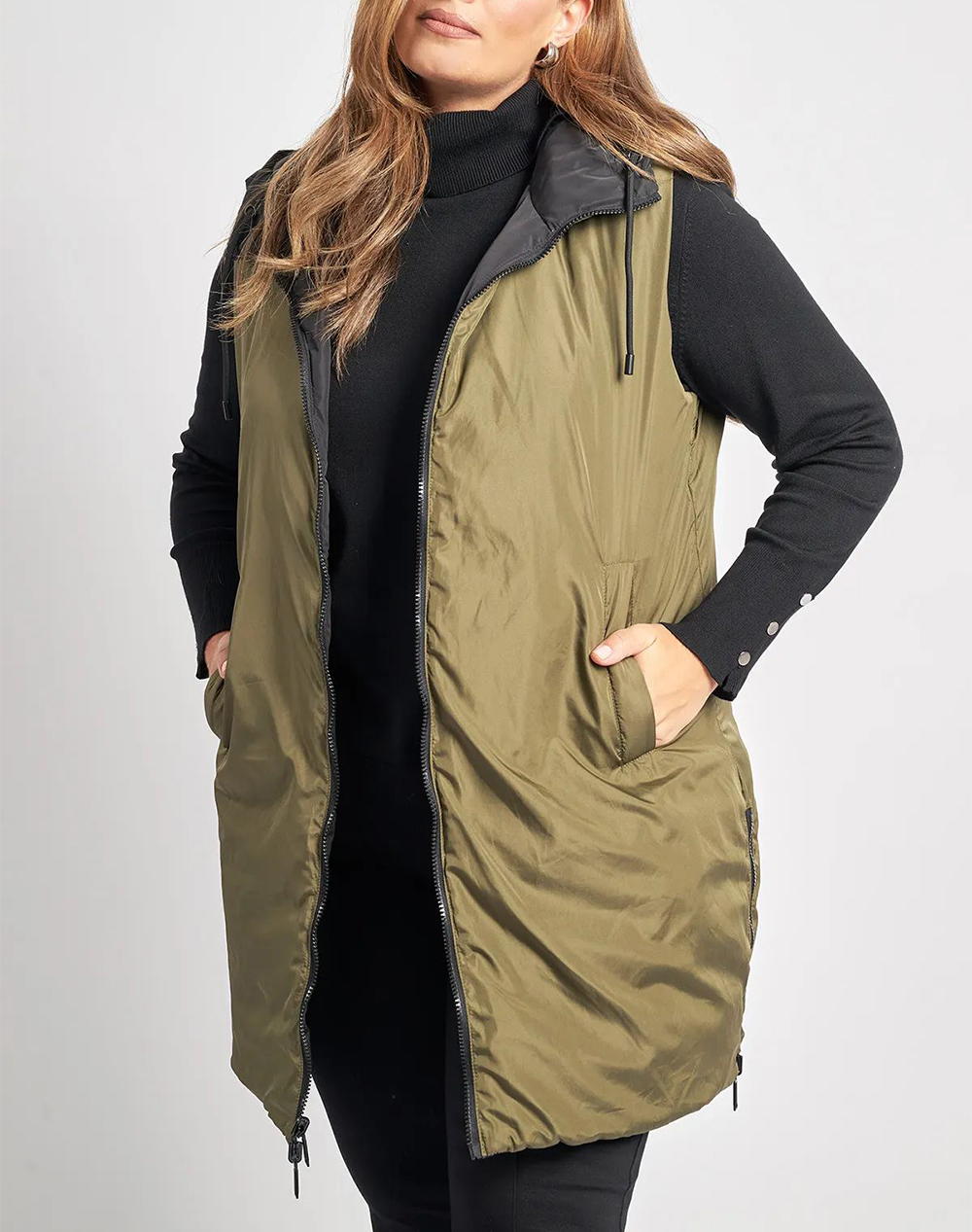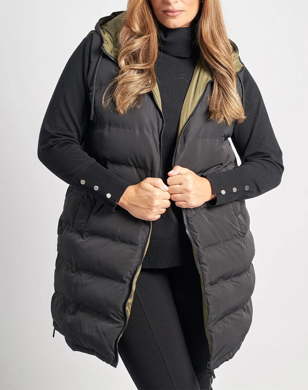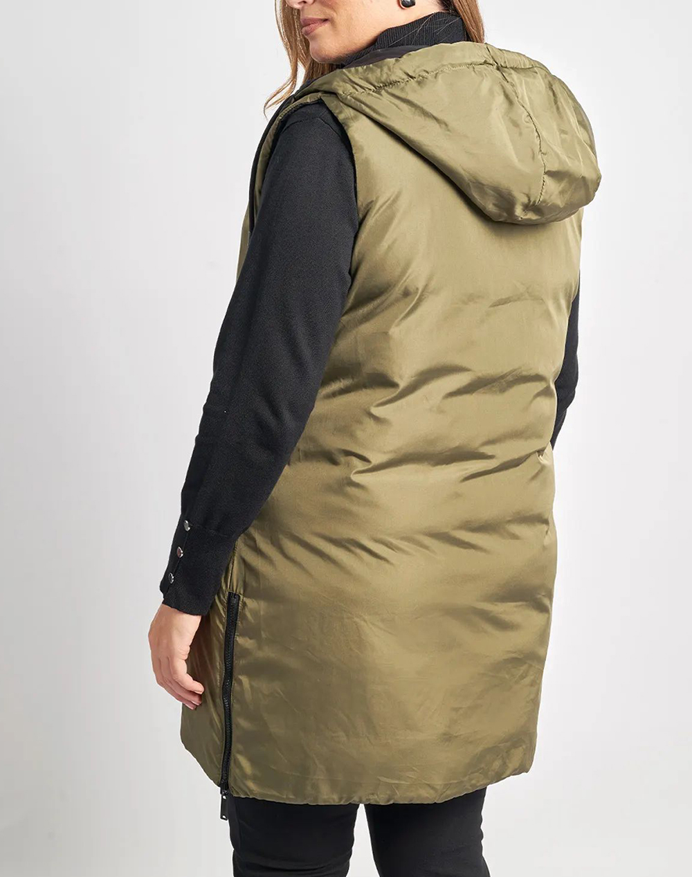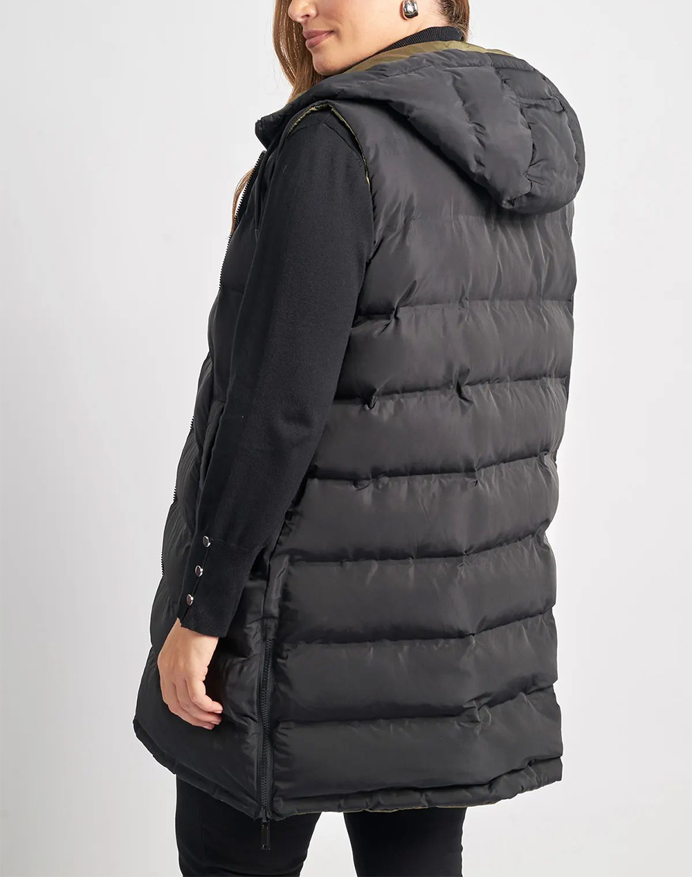 Γυναικείο αμάνικο μπουφάν, καπιτονέ, διπλής όψης, με κουκούλα, τσέπες στο πλάι και κλείσιμο με φερμουάρ.(Σύνθεση: 100% Πολυεστέρας)