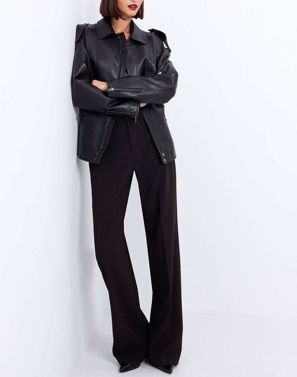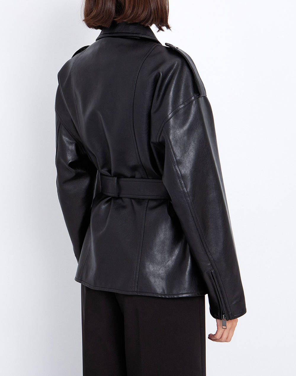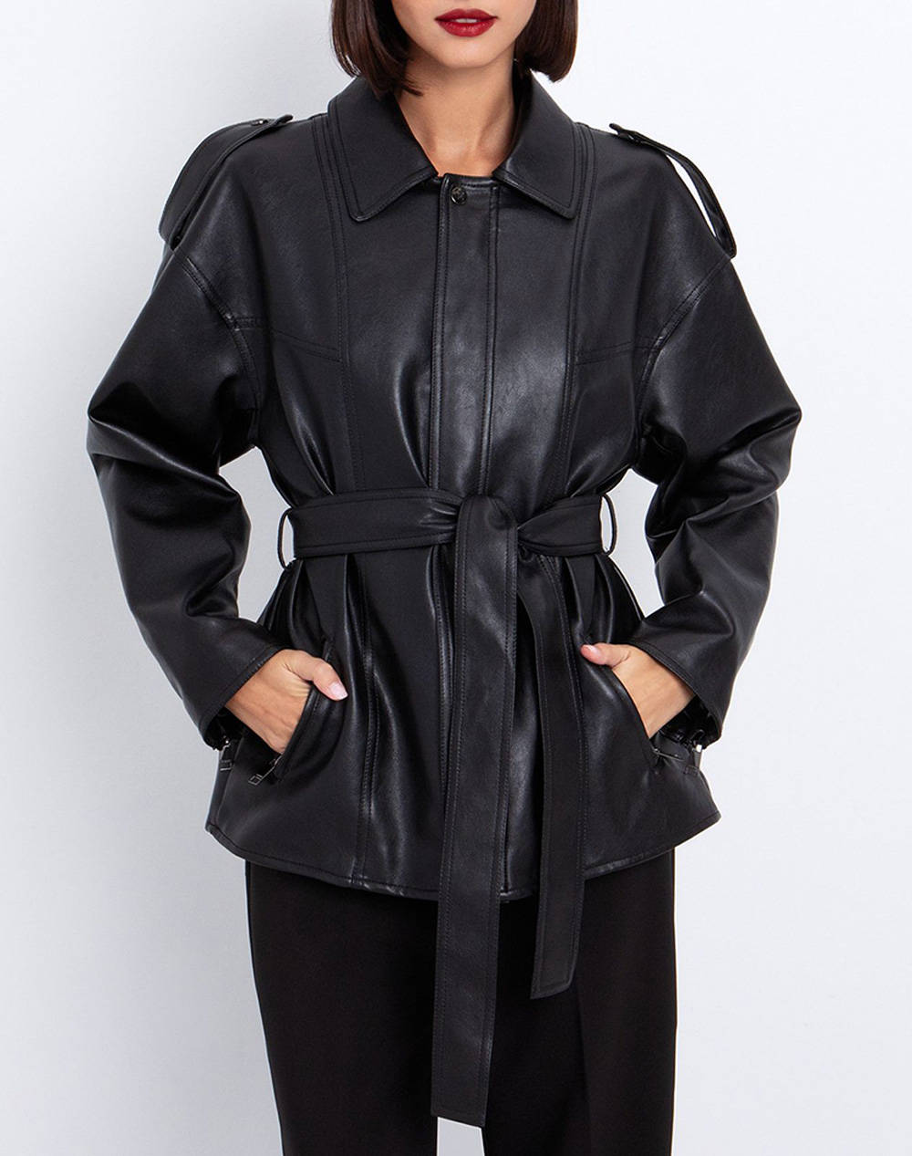 Γυναικείο τζάκετ, σε στυλ biker, με τσέπες, κρυφό κλείσιμο με φερμουάρ και κουμπί-σούστα και δέσιμο με ζώνη στη μέση.(Σύνθεση: 65% Πολυουρεθάνη, 30% Πολυεστέρας, 5% Βαμβάκι)