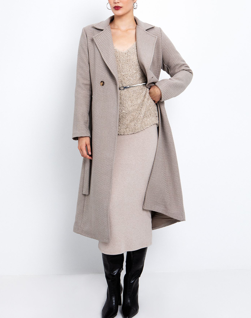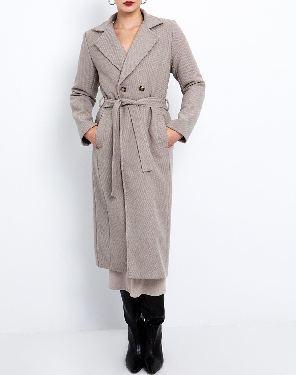 Γυναικείο παλτό, σε κανονική γραμμή, με σταυρωτό κλείσιμο με κουμπί, παλϊνές τσέπες και ζώνη ίδιας ύφανσης στη μέση. (Σύνθεση: 60% Πολυεστέρας, 20% Βισκόζη, 20% Polycarbonate)