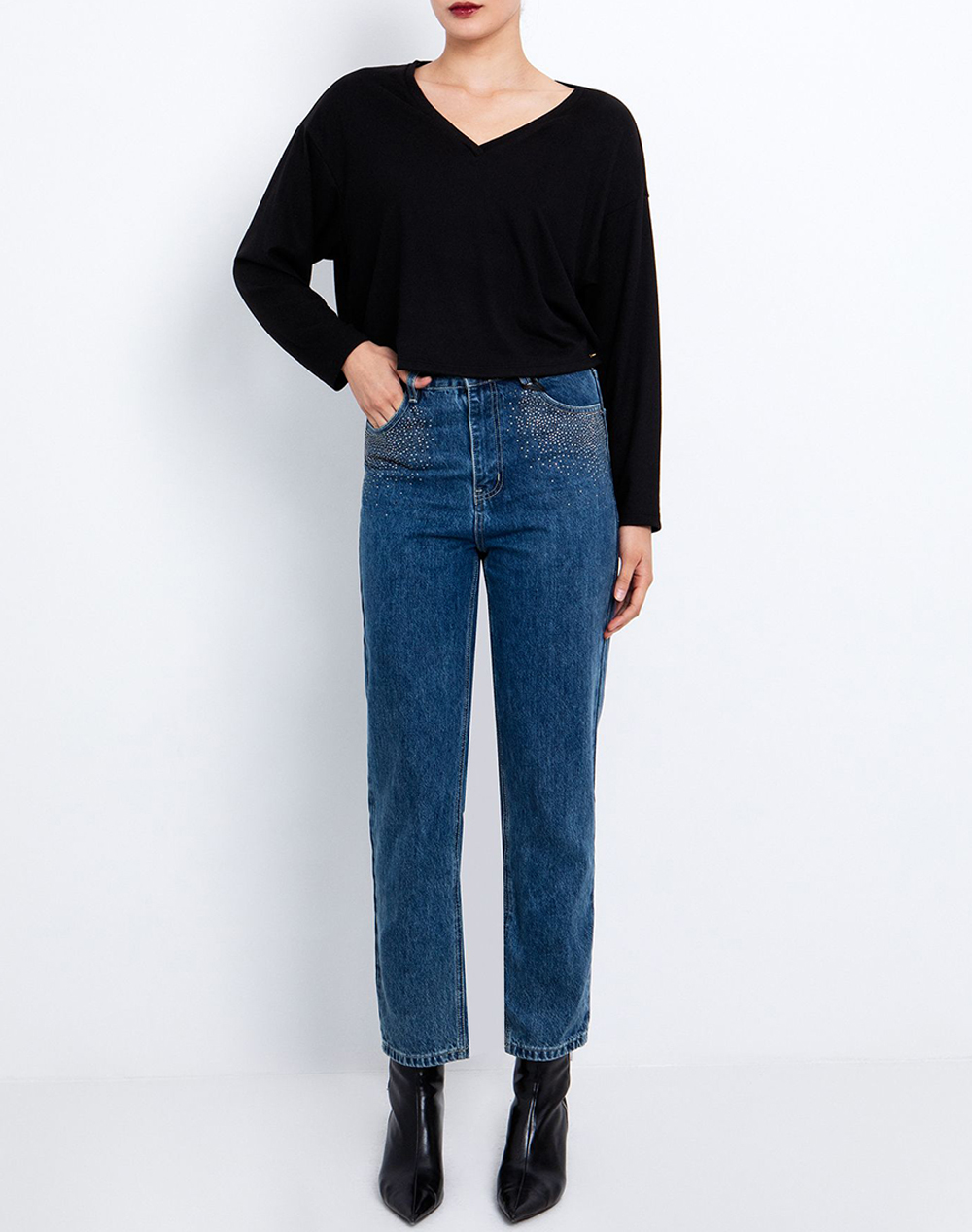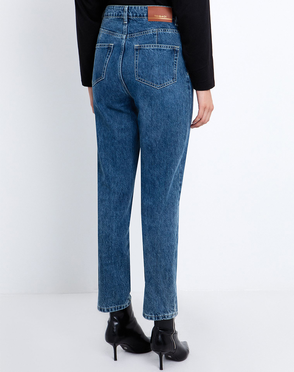Γυναικείο τζίν παντελόνι, mom fit, σε ίσια γραμμή, ψηλόμεσο, με πεντάτσεπο σχέδιο, διακοσμητικά τρουκς και κλείσιμο με φερμουάρ και κουμπί. (Σύνθεση: 90% Βαμβάκι, 10% Πολυεστέρας)