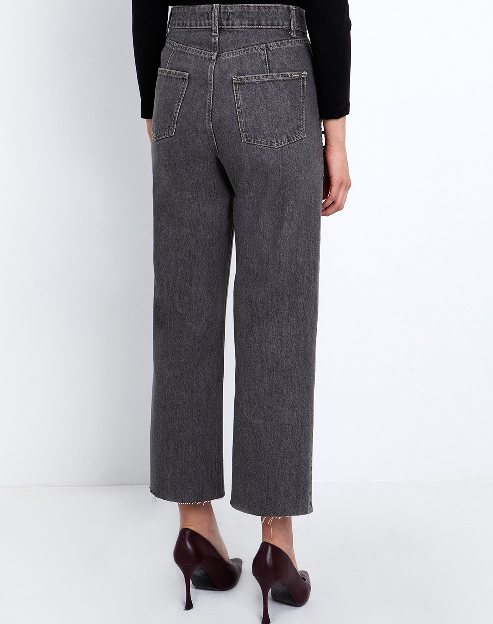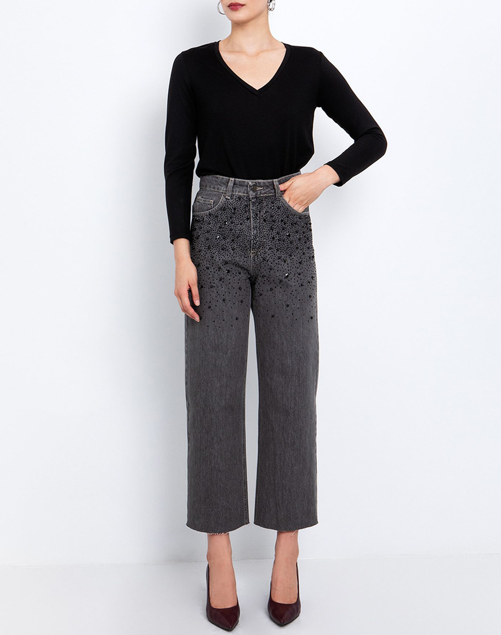 Γυναικείο jean παντελόνι, σε κανονική, ίσια γραμμή, ψηλόμεσο, με πεντάτσεπο σχέδιο, τελείωμα με ξέφτια και κλείσιμο με φερμουάρ και κουμπί. (Σύνθεση: 100% Βαμβάκι)