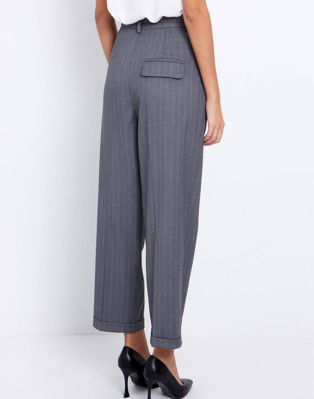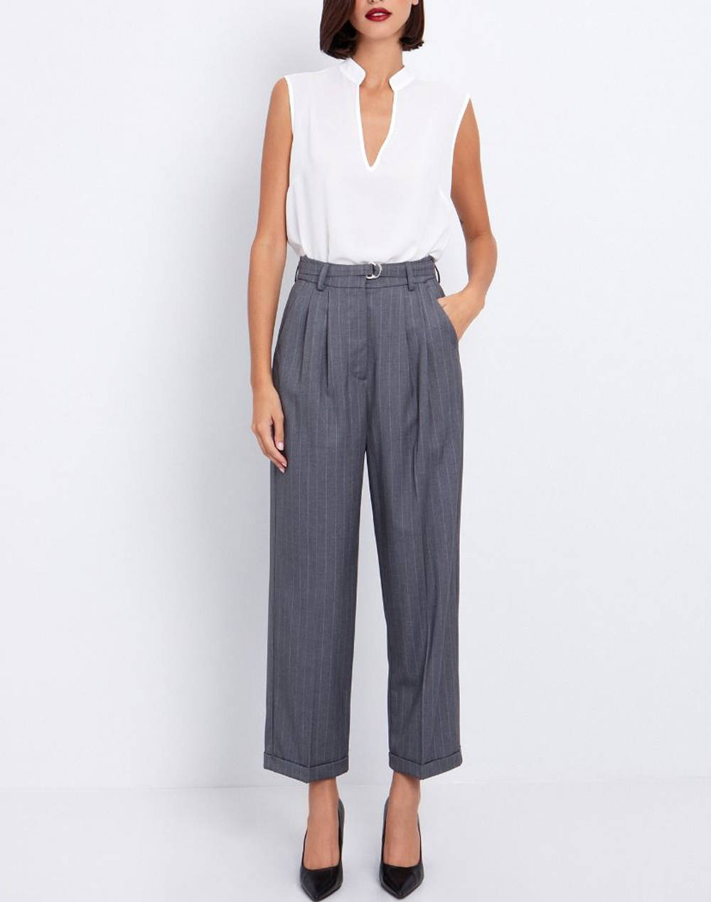 Γυναικείο παντελόνι, σε κανονική γραμμή, ψηλόμεσο, με πλισέ λεπτομέρεια στο μπροστινό μέρος και ζώνη από το ίδιο ύφασμα με μεταλλική αγκράφα. (Σύνθεση: 69% Πολυεστέρας, 29% Βισκόζη, 2% Ελαστάνη)