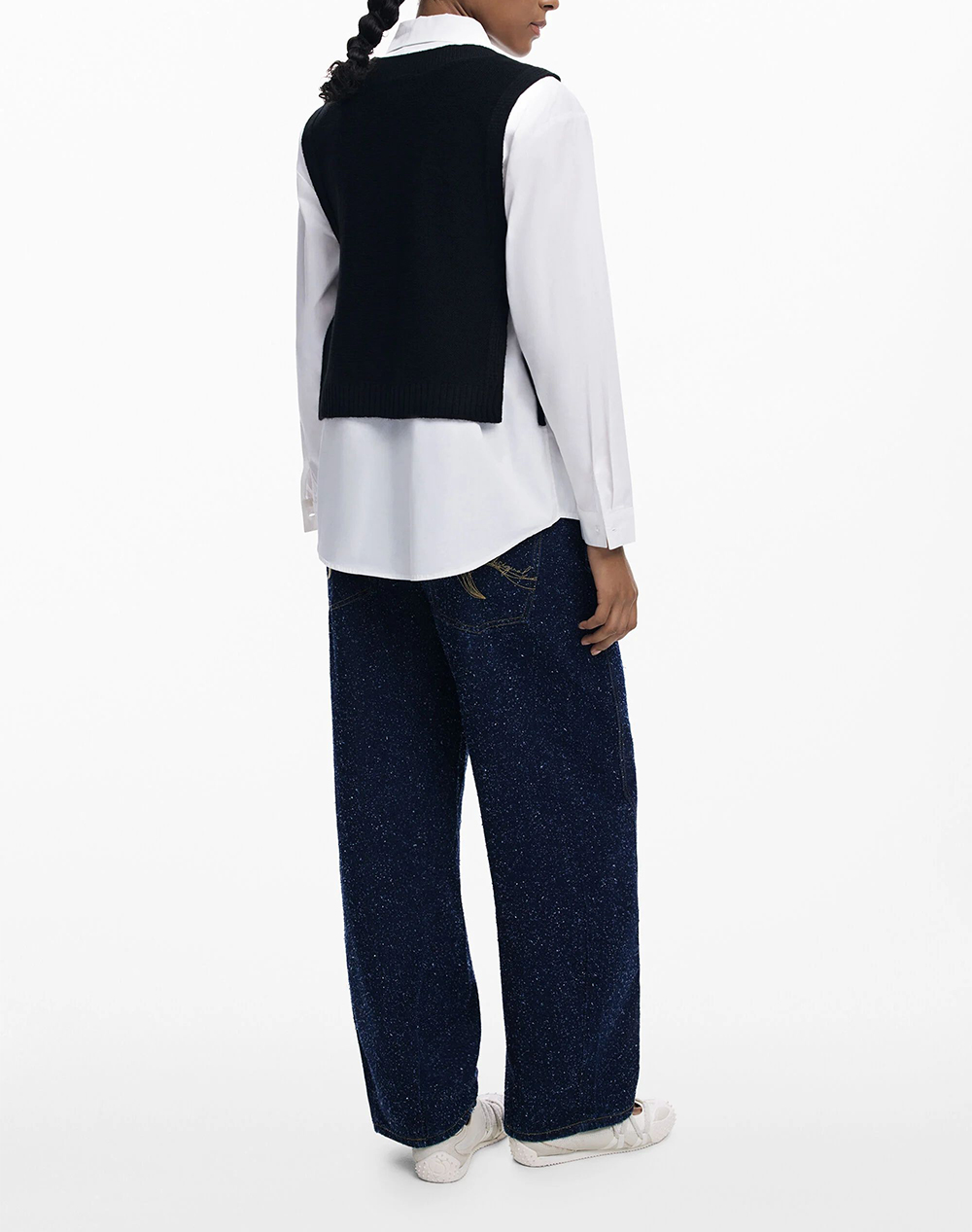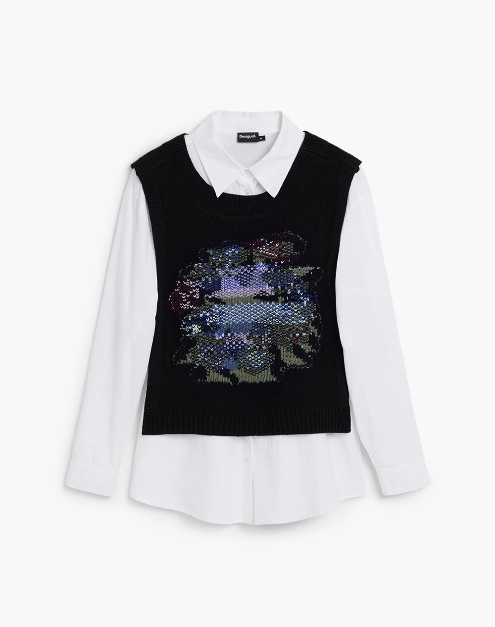 Γυναικείο πουκάμισο με πλεκτό γιλέκο από βαμβακερό ύφασμα.