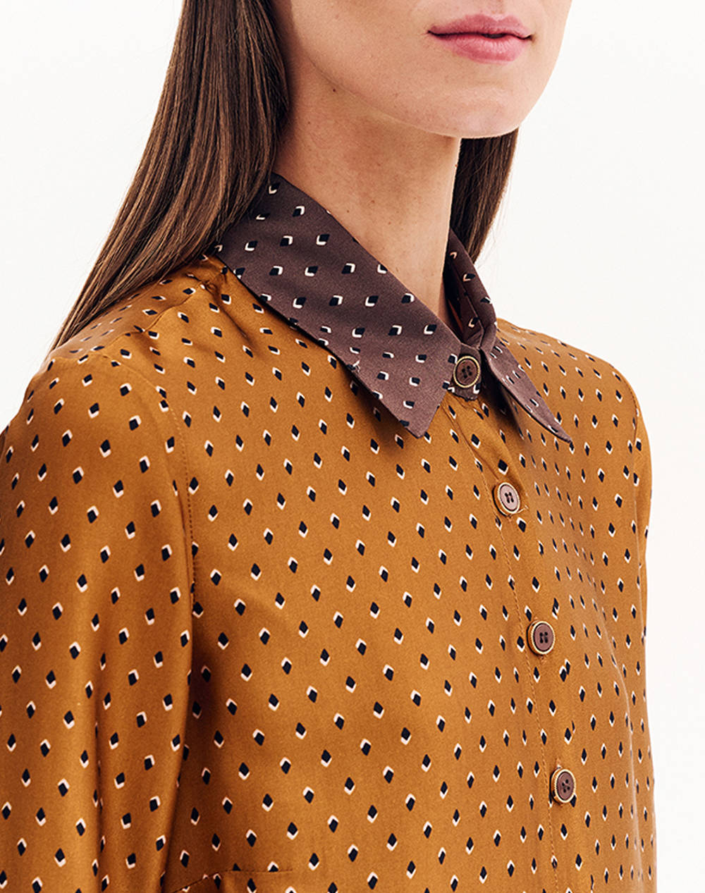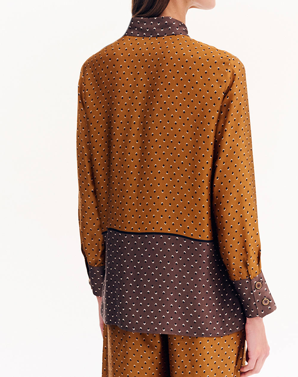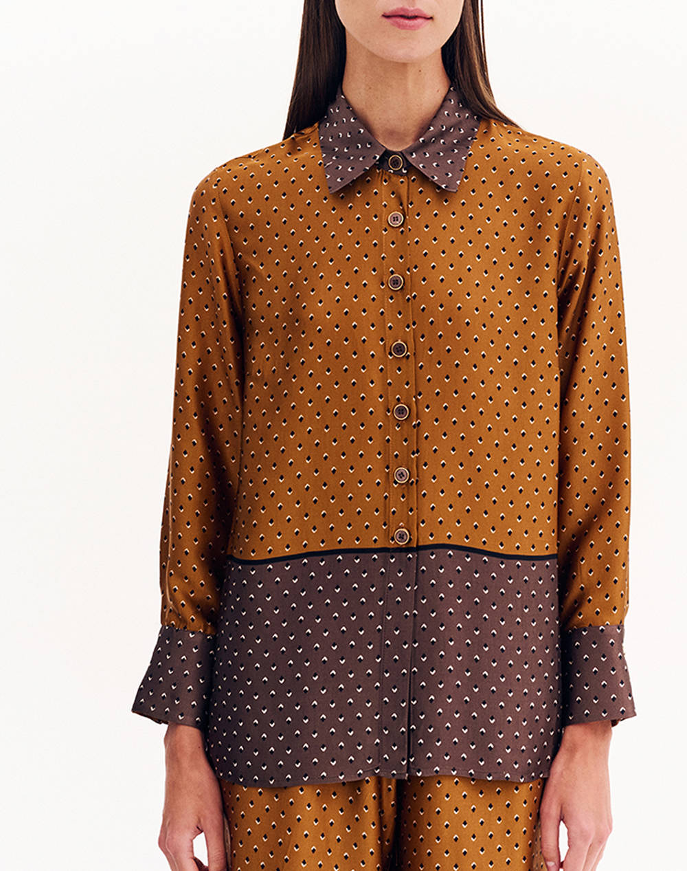 Γυναικείο σατέν πουκάμισο, σε άνετη γραμμή, μακρυμάνικο, με colorblock μοτίβο και μικροσχέδιο. Κλείνει μπροστά με κουμπιά. (Σύνθεση: 100% Βισκόζη)