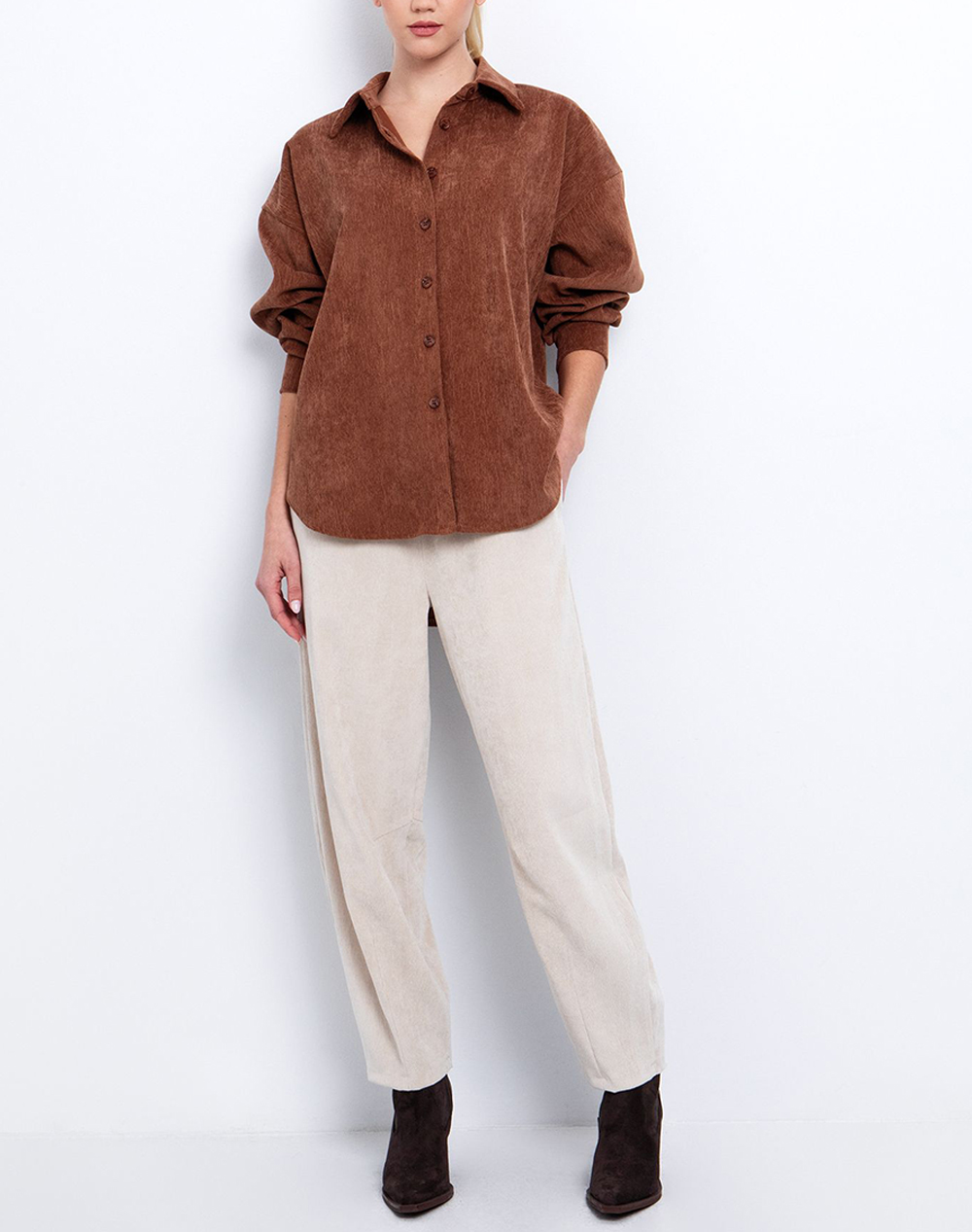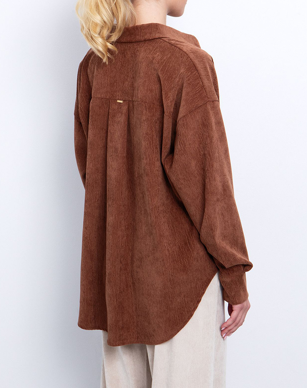 Γυναικείο κοτλέ πουκάμισο, σε άνετη γραμμή, μακρυμάνικο, με λεπτομέρεια πιέτας στην πλάτη και ασσύμετρο τελείωμα. (Σύνθεση: 87% Πολυεστέρας, 10% Πολυαμίδιο, 3% Ελαστάνη)