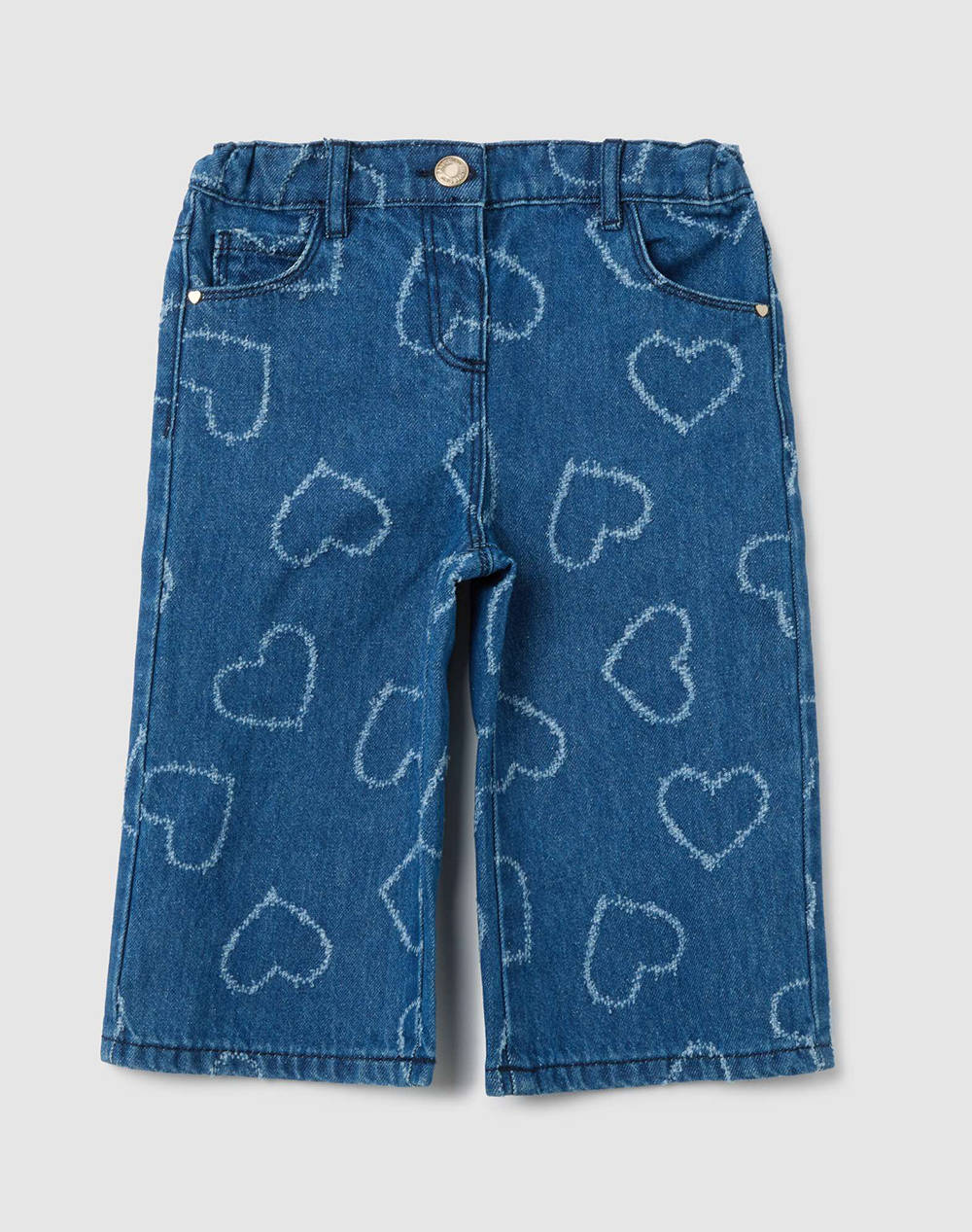 Βρεφικό τζιν παντελόνι, σε φαρδιά γραμμή, με all over print, τσέπες, ρυθμιζόμενη μέση εσωτερικά και κλείσιμο με κουμπί. (Σύνθεση: 100% Βαμβάκι)
