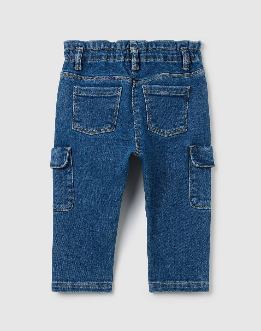 Βρεφικό τζιν παντελόνι, σε κανονική γραμμή, με πλαϊνές τσέπες με κουμπιά, ρυθμιζόμενη ελαστική μέση εσωτερικά και κλείσιμο με κουμπί. (Σύνθεση: 98% Βαμβάκι, 2% Ελαστάνη)