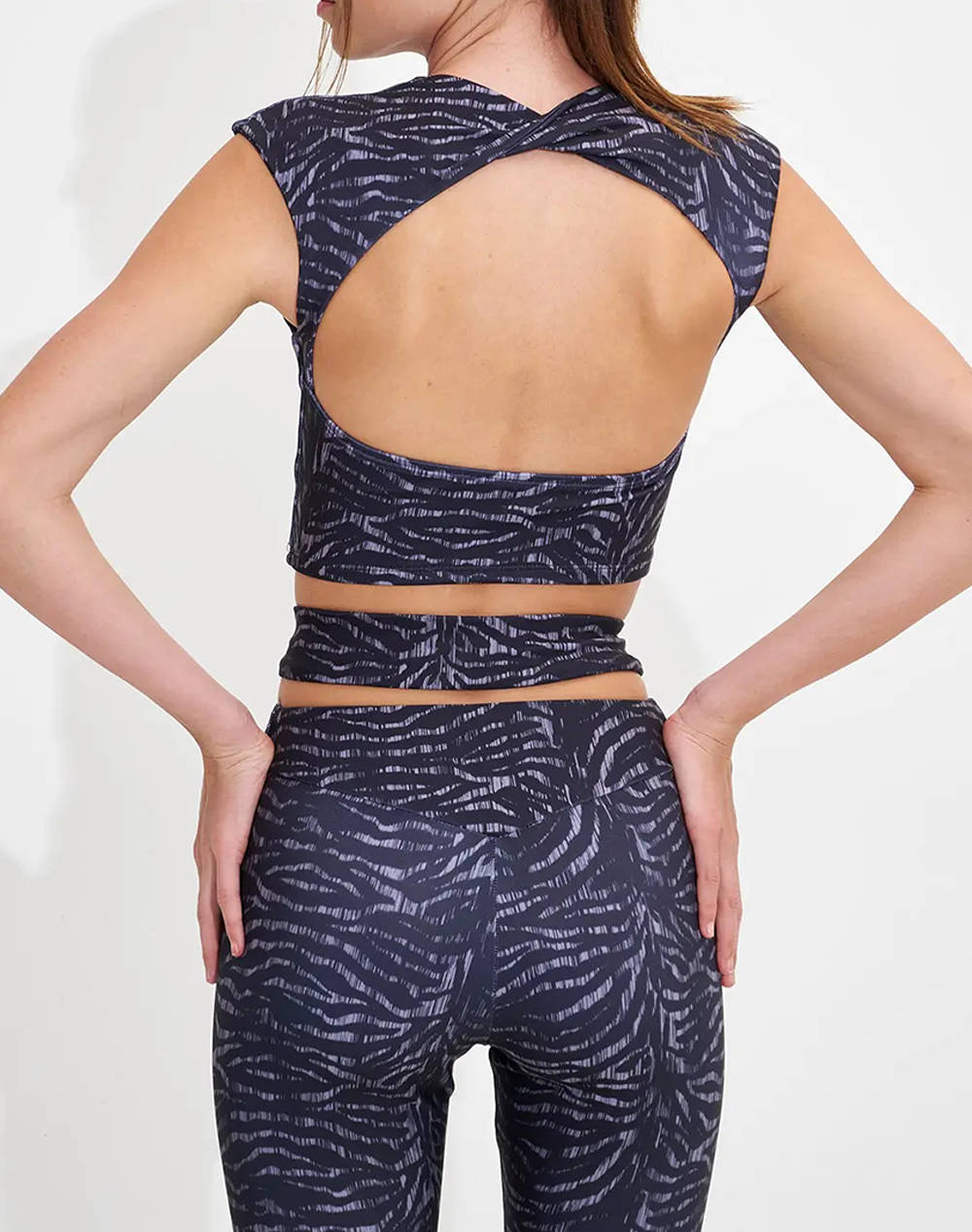Γυναικείο τοπ, γυμναστικής, σε στενή γραμμή, ζεβρέ, αμάνικο, με αφαιρούμενα cups, στρογγυλή λαιμόκοψη και ανοιχτή πλάτη. (Σύνθεση: 90% Πολυεστέρας, 10% Ελαστάνη)