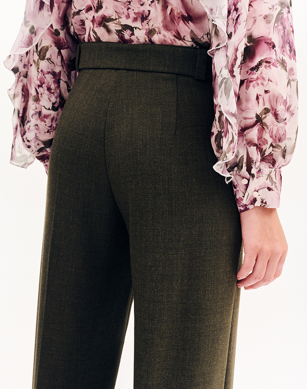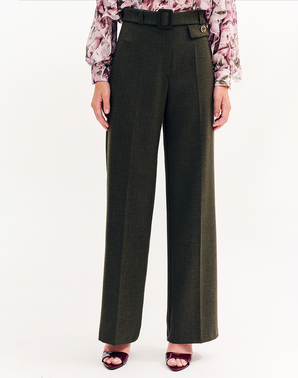 Women's straight-leg pants with a decorative small pocket on the front, a self-fabric belt and a zipper and button closure. (Composition: 92% Polyester, 6% Rayon, 2% Spandex)