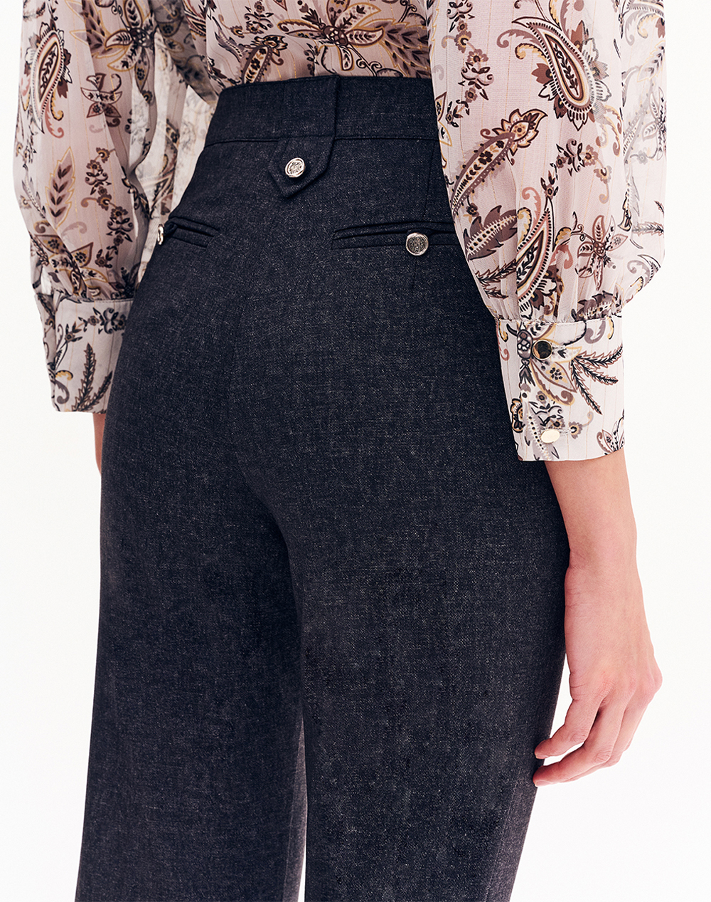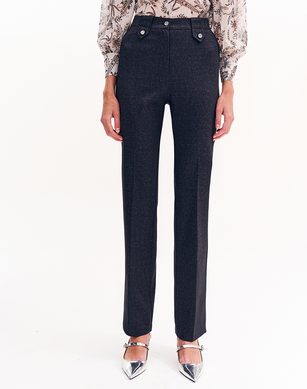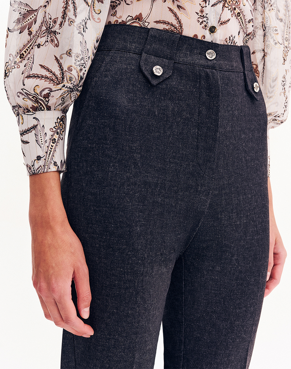 Women's trousers, straight-leg, high-waisted, with decorative button details and zipper and button closure. (Composition: 60% Polyester, 35% Viscose, 5% Elastane)