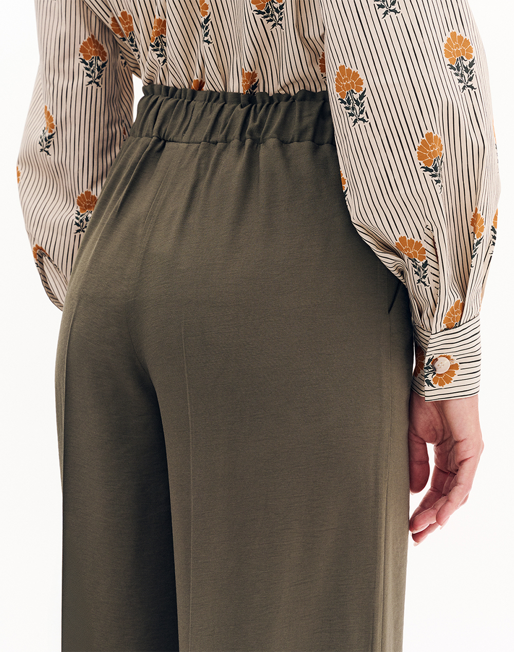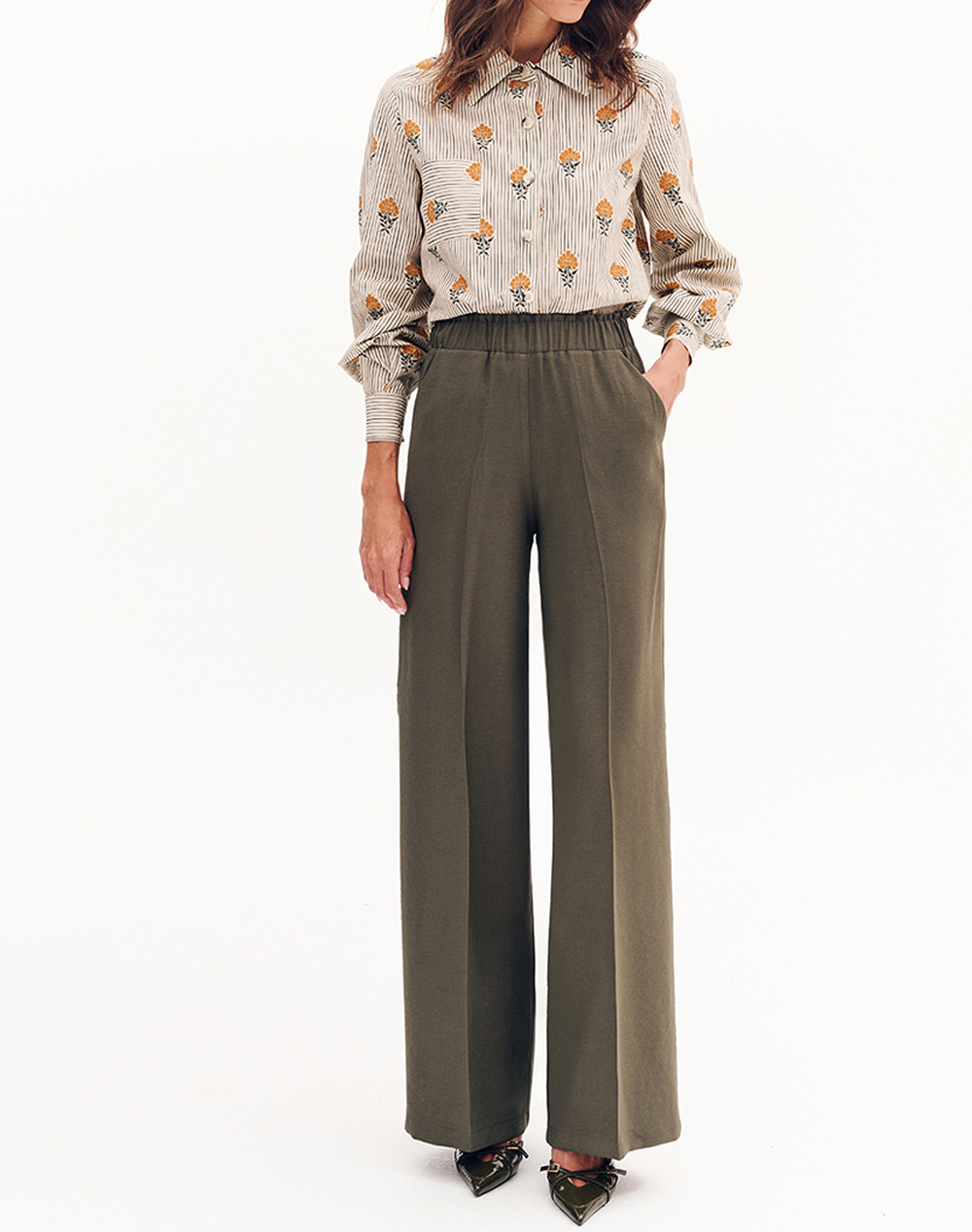 Women's straight-leg pants with side slit pockets and elastic waist. (Composition: 93% Rayon, 7% Polyester)