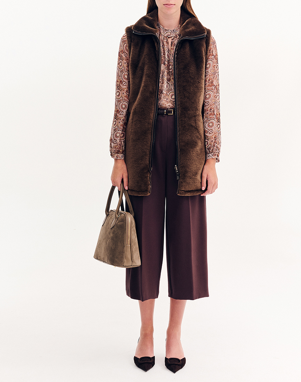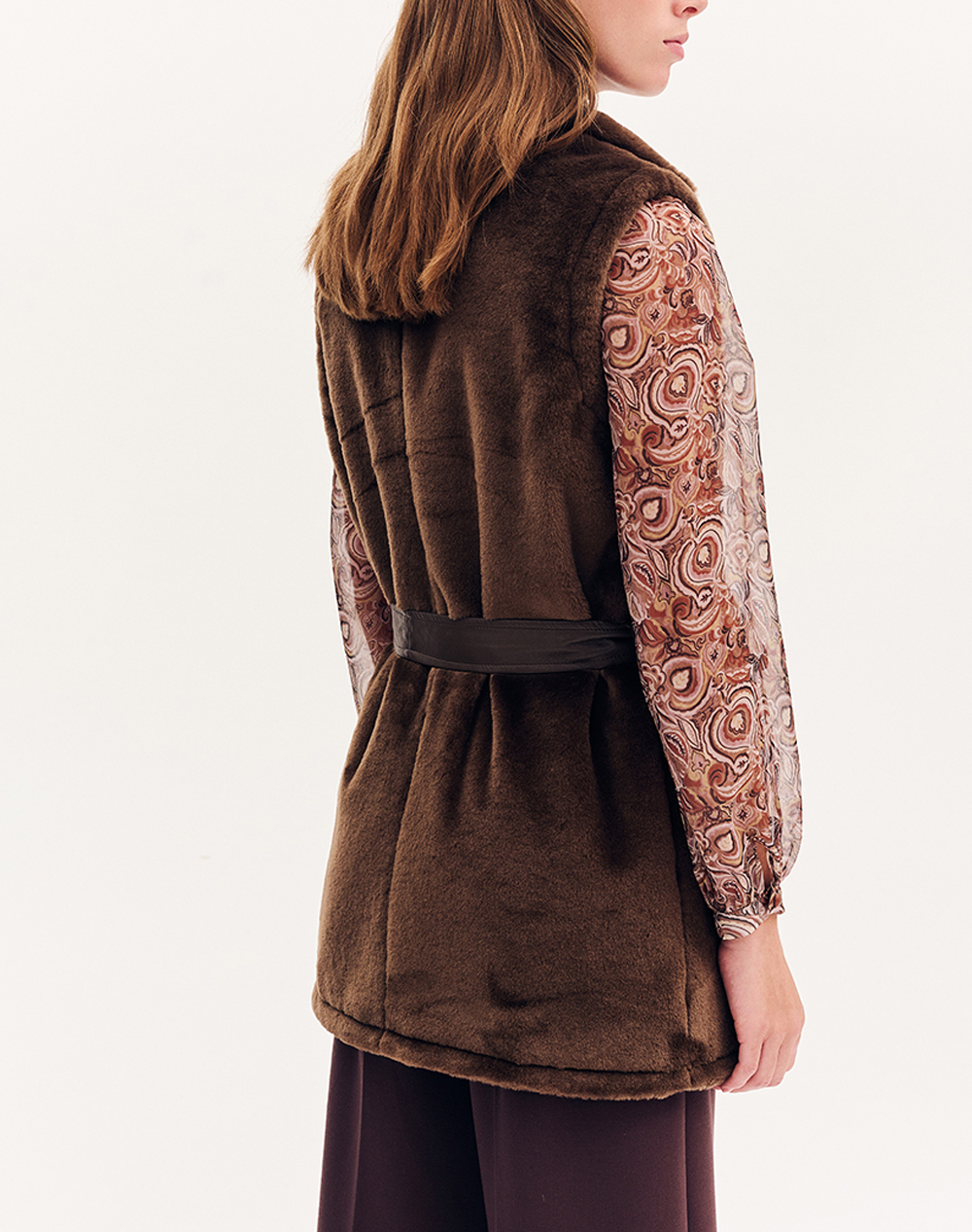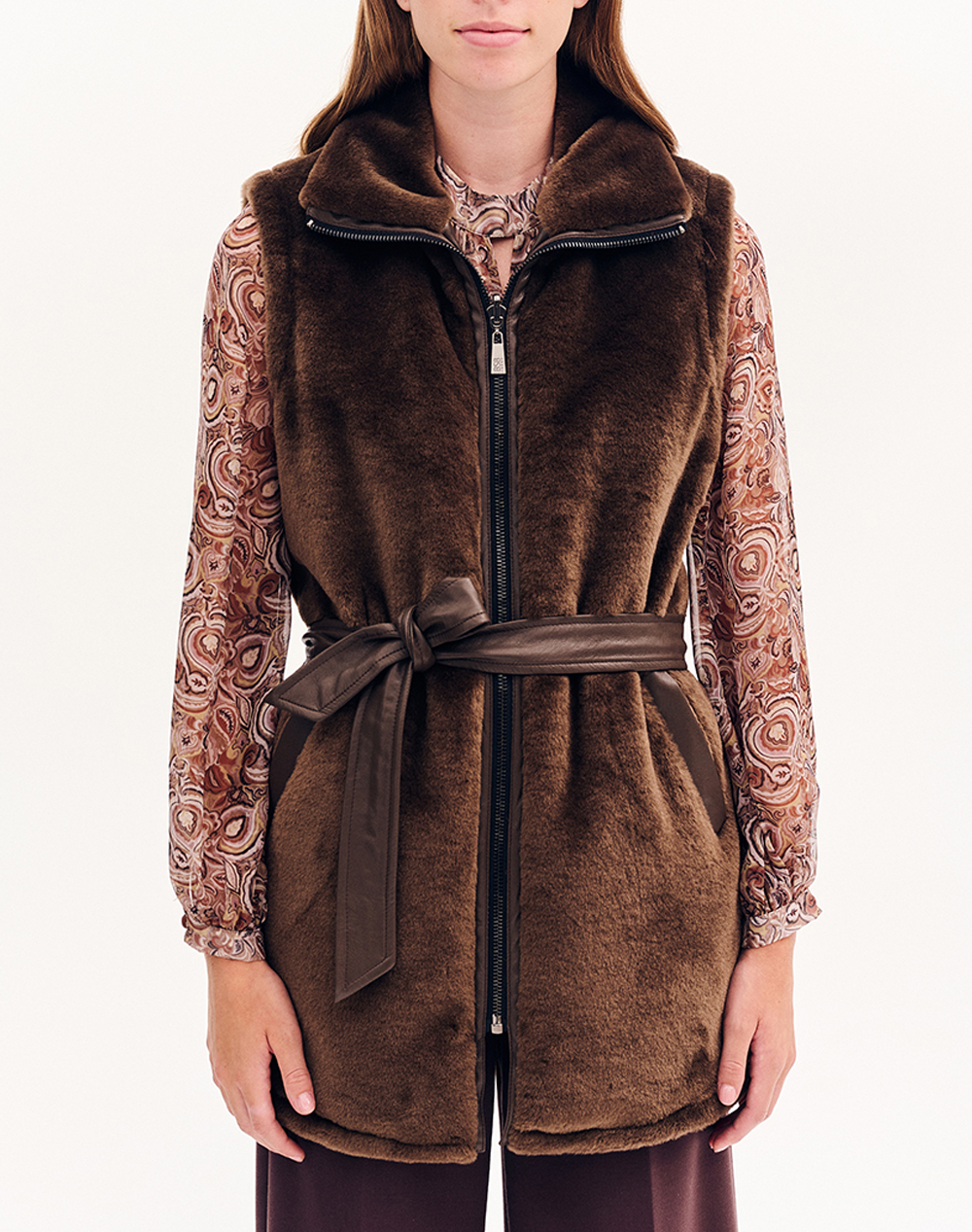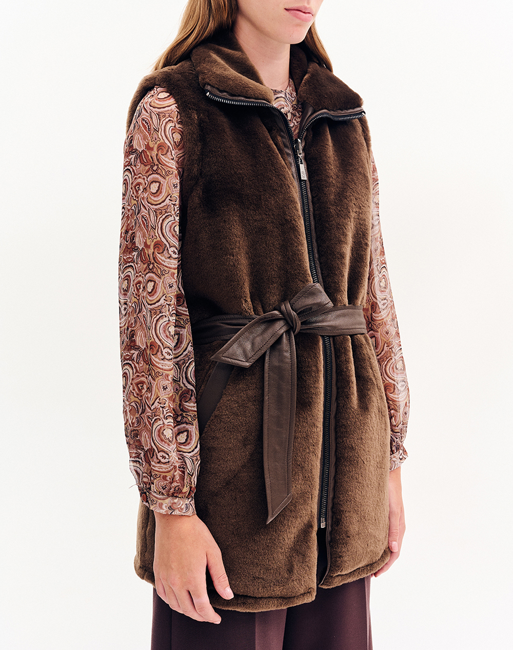 Women's fur vest, sleeveless, with a high neckline that opens into a collar. It closes with a zipper and has a belt made of eco-leather. (Composition: 100% Polyester)