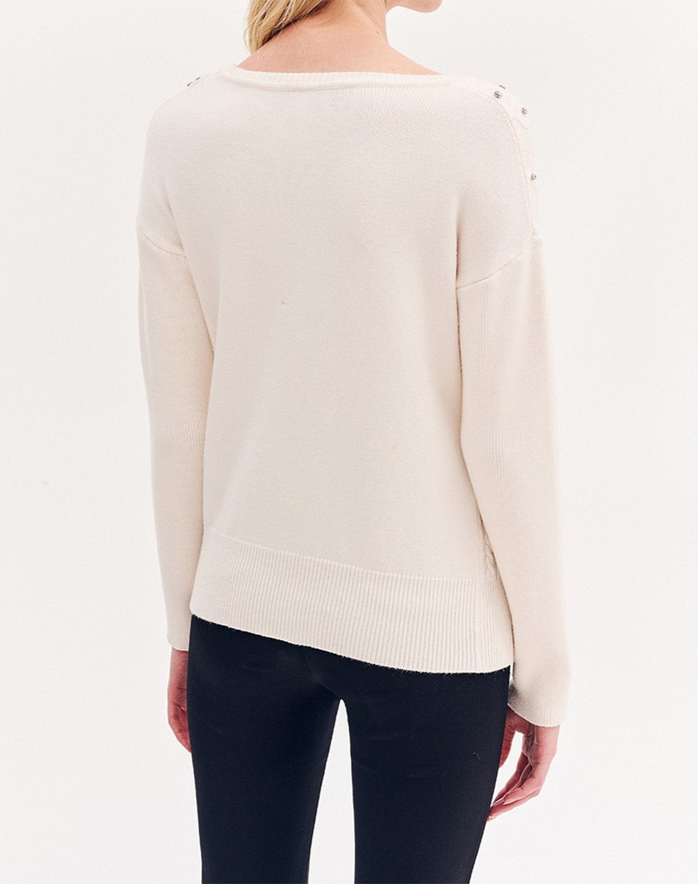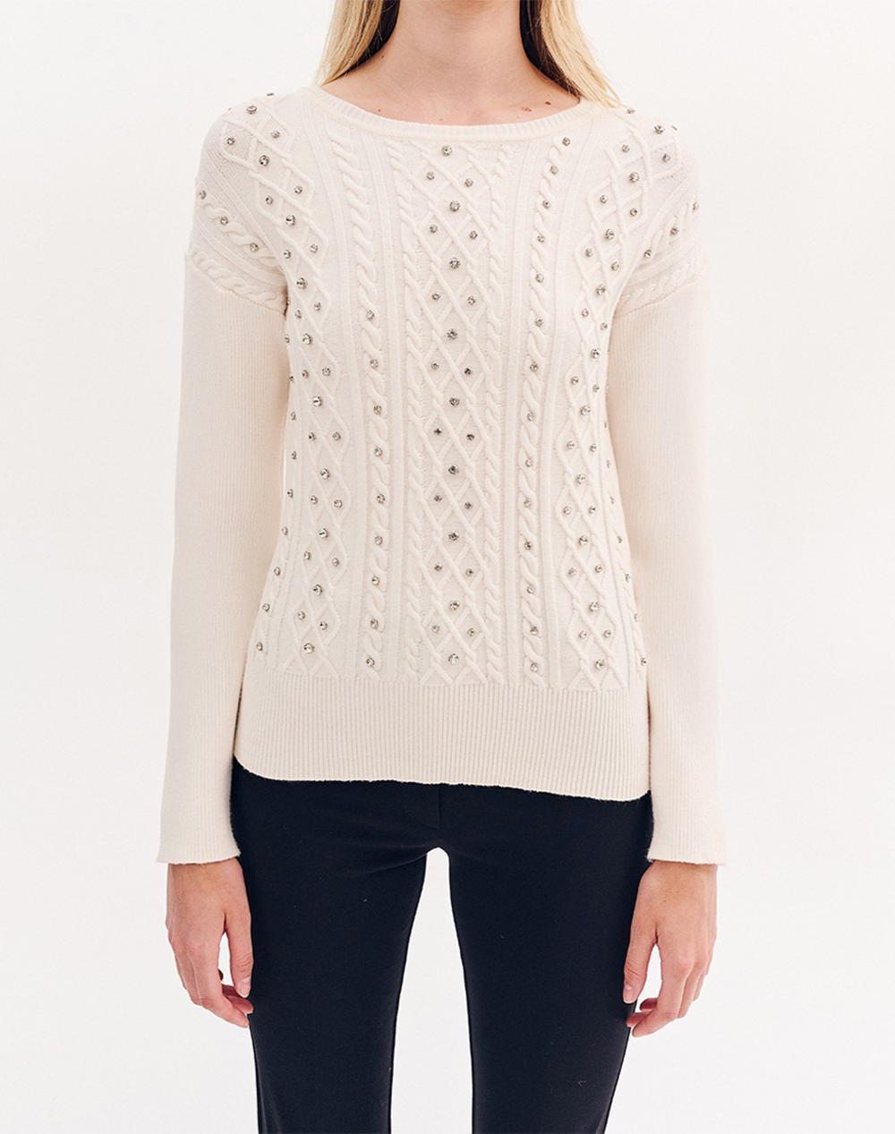 Women's sweater, regular fit, long sleeve, with round neckline and front design with braids and strass. (Composition: 49% Viscose, 28% Polyester, 23% Nylon)