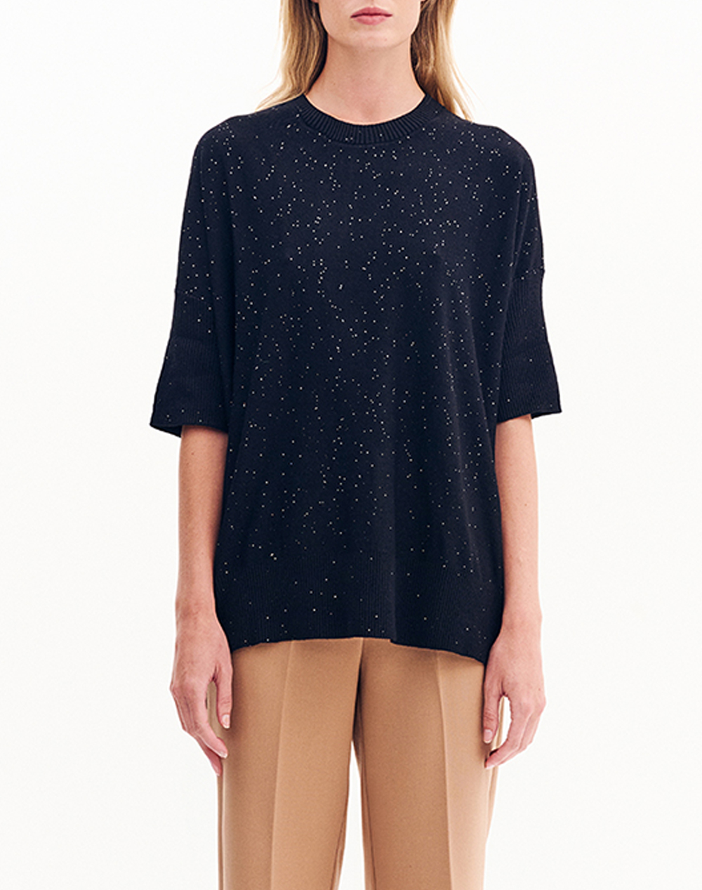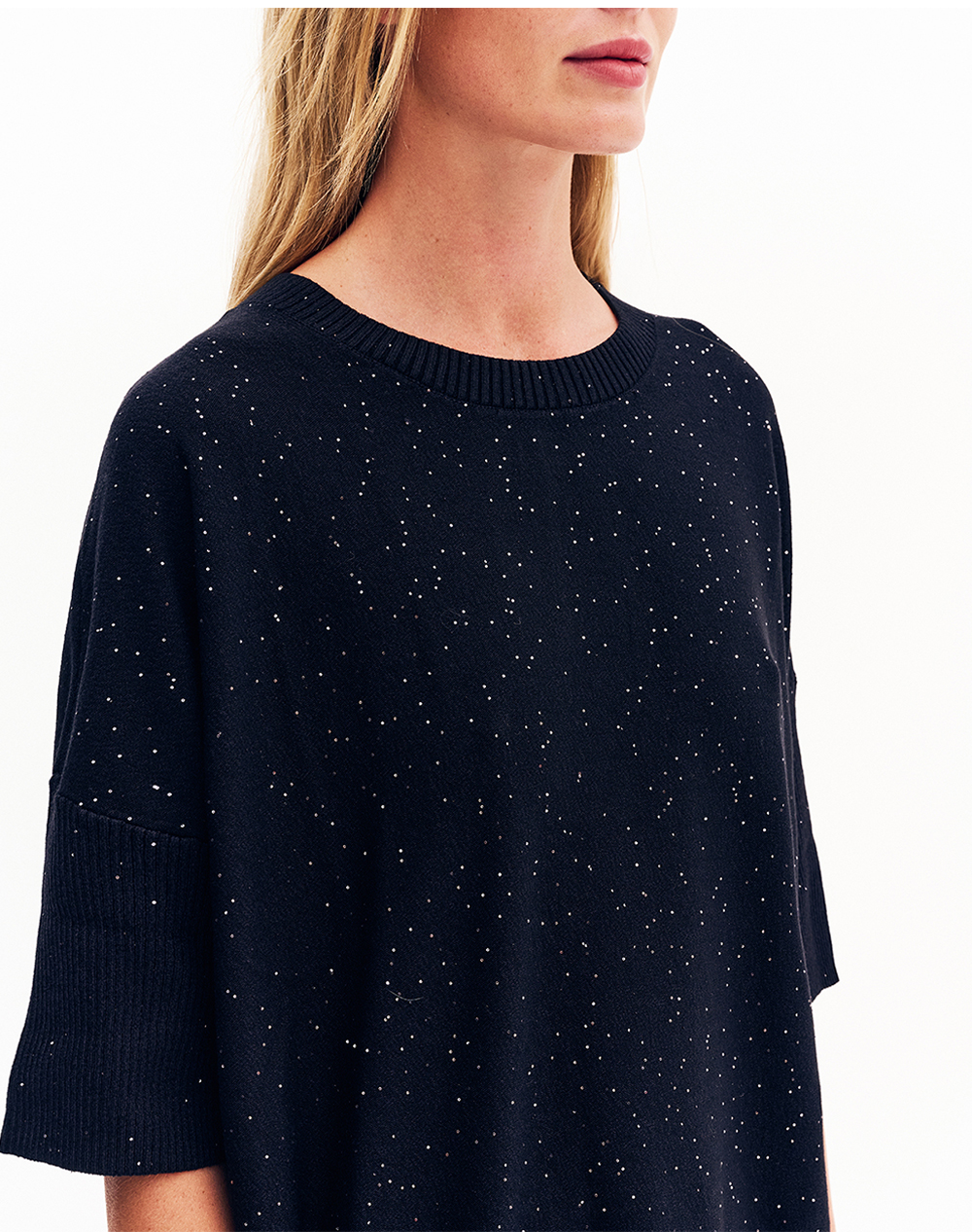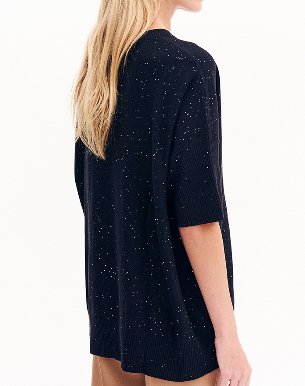 Women's knitted top, in a comfortable fit, with 3/4 sleeves, round neckline and a design with fine sequins. (Composition: 47% Viscose, 35% Polyester, 18% Polyamide)