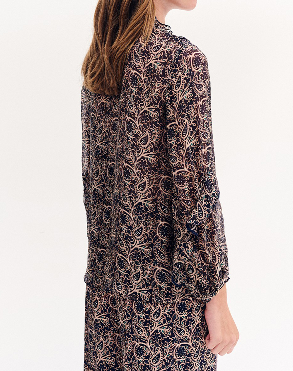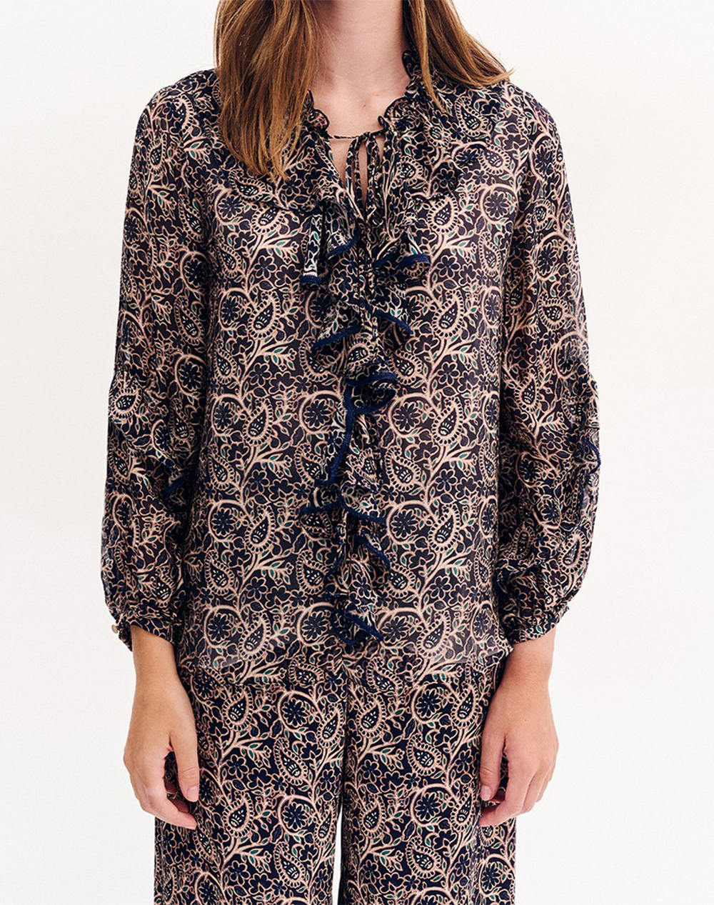Women's blouse, long-sleeved, with printed pattern, round neckline and "V" neckline with ruffles. (Composition: 70% Viscose, 30% Seta)