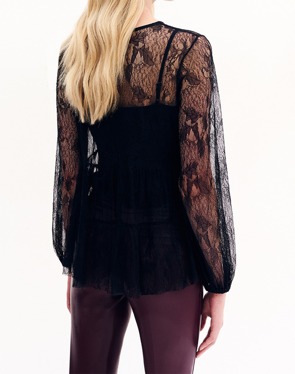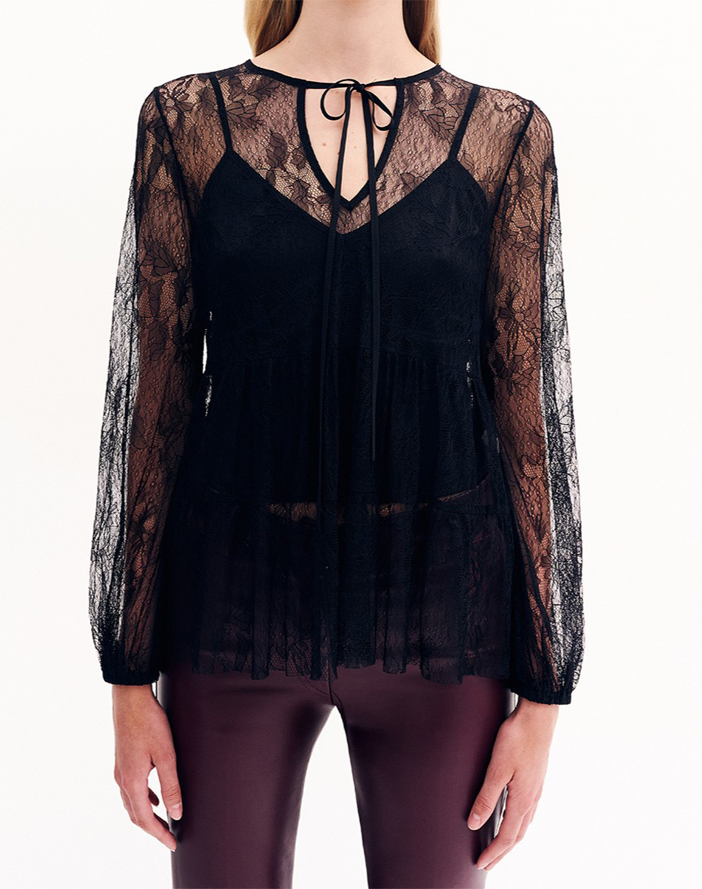 Women's blouse, made of lace, long sleeves, features a "V" neckline with ties and an internal top strap. (Composition: 100% Nylon)