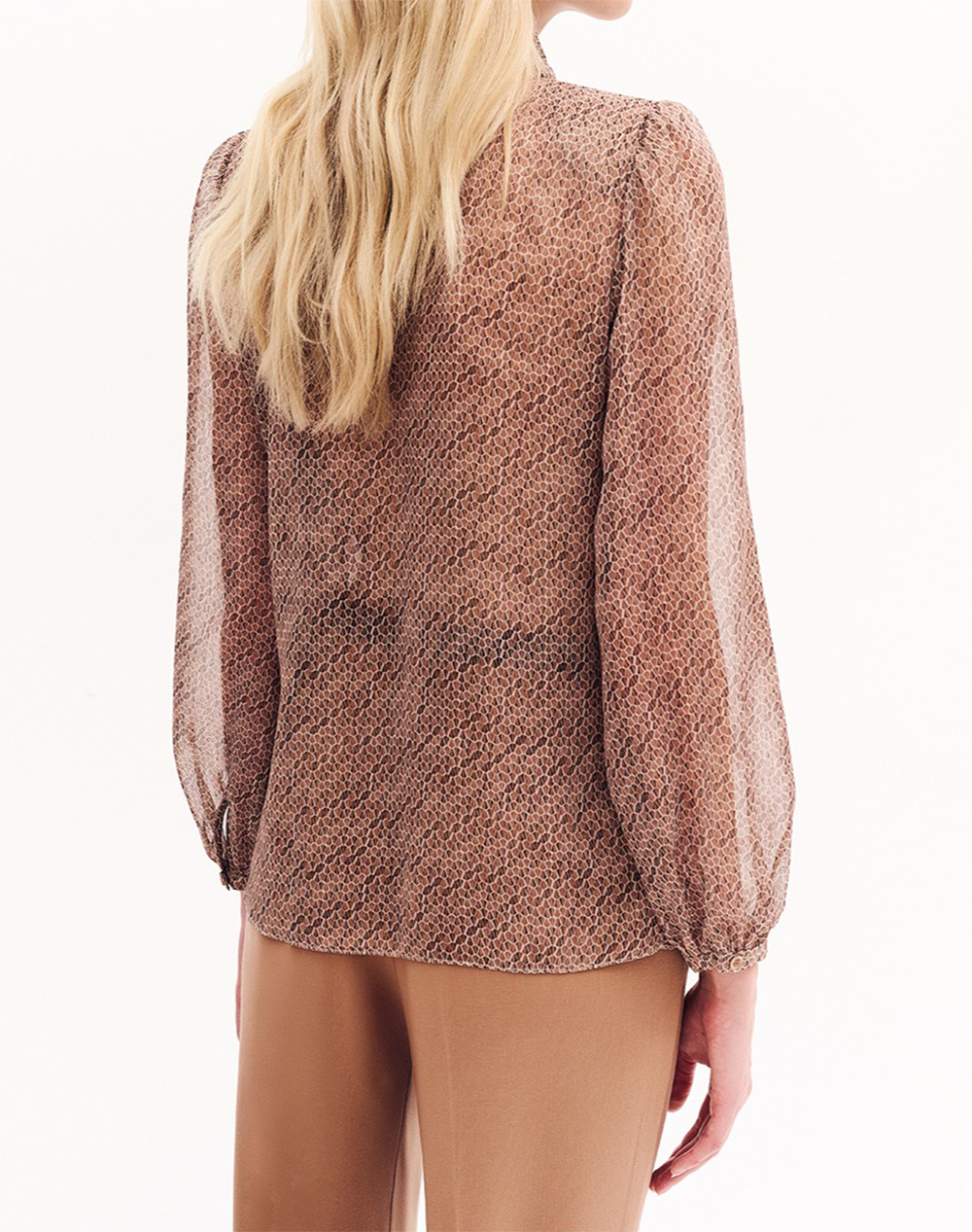 Women's blouse, long-sleeved, with printed pattern, padded shoulders and high neckline with tie. (Composition: 99% Polyester, 1% Metallic fiber)
