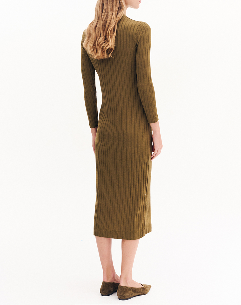 Women's knitted dress, fitted, long-sleeved, with high neckline, rib weave and decorative buttons on the shoulders. (Composition: 50% Viscose, 25% Polyester, 25% Polyamide)