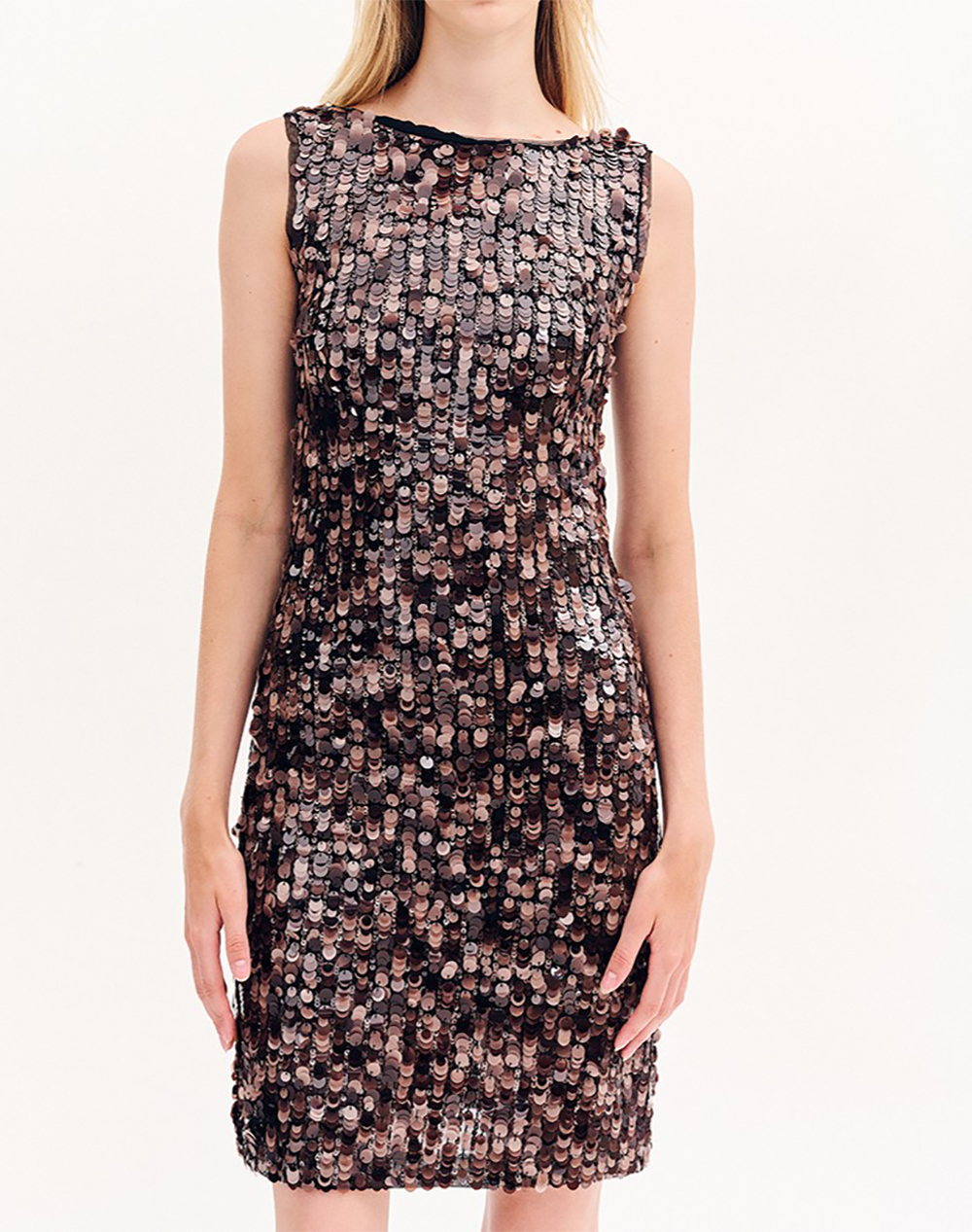 Women's short dress, with sequins all over, sleeveless, with a round neckline and an open "V" shaped back. It closes with a zipper on the back. (Composition: Synthetic fabric)