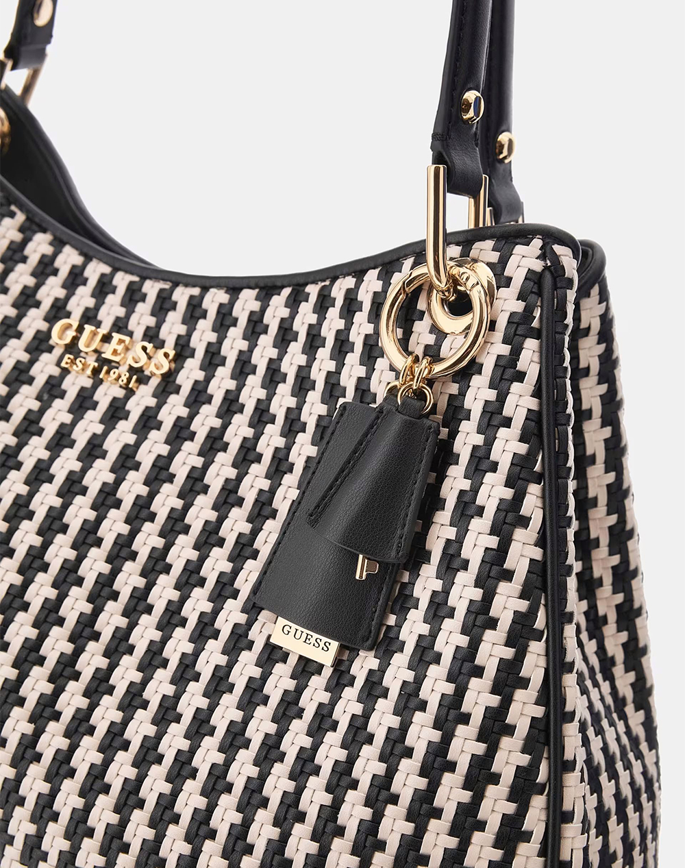 Women's bag with knitted leatherette exterior, interior and back zippered pockets, detachable logo charm at the base of the handle and button closure. Dimensions 44 x 29 x 12 cm. (Composition: 100% Polyurethane)