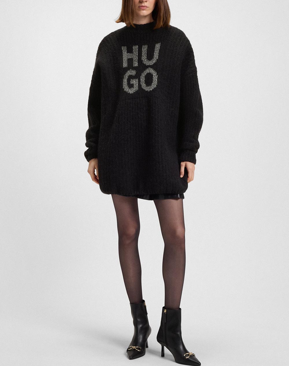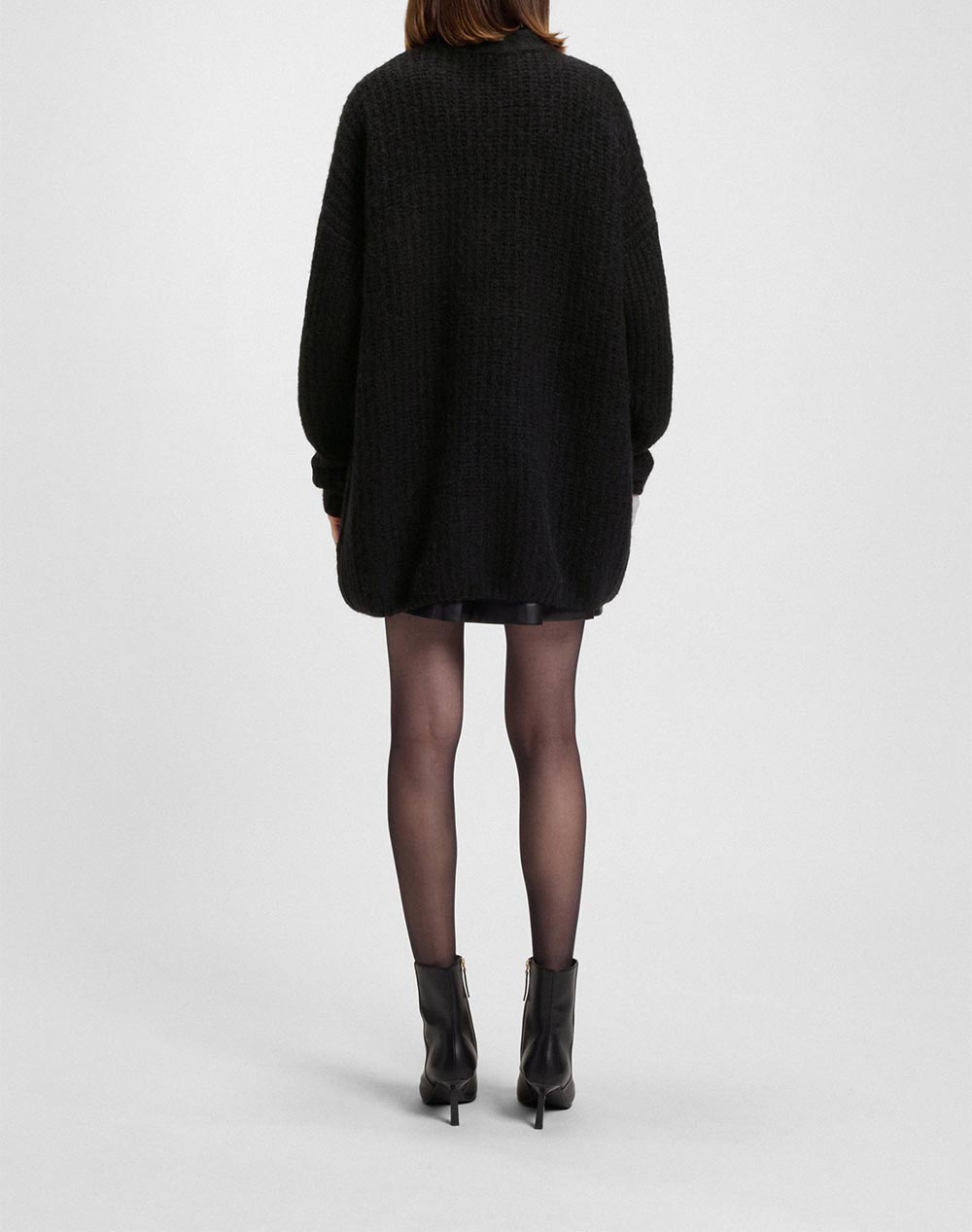 Women's long sweater, oversized, long-sleeved, with round neckline and logo on the front. (Composition: 38% Wool, 30% Polyacrylic, 18% Alpaca, 13% Polyamide, 1% Elastane)
