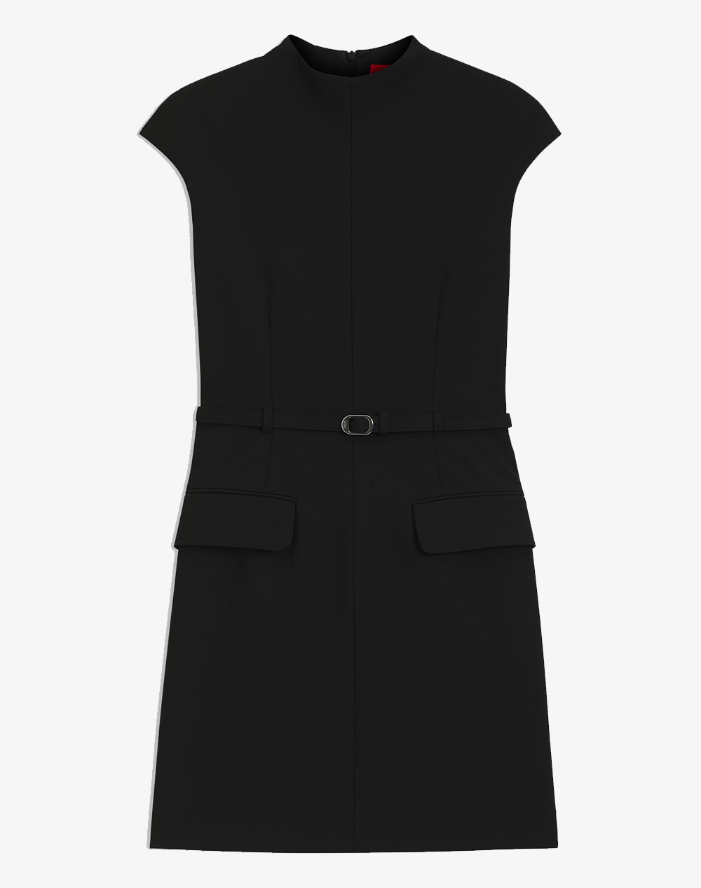 Women's short dress, regular fit, short sleeves, mock neckline, thin belt at the waist and zipper closure at the back. (Composition: 64% Polyester, 31% Viscose, 5% Elastane)