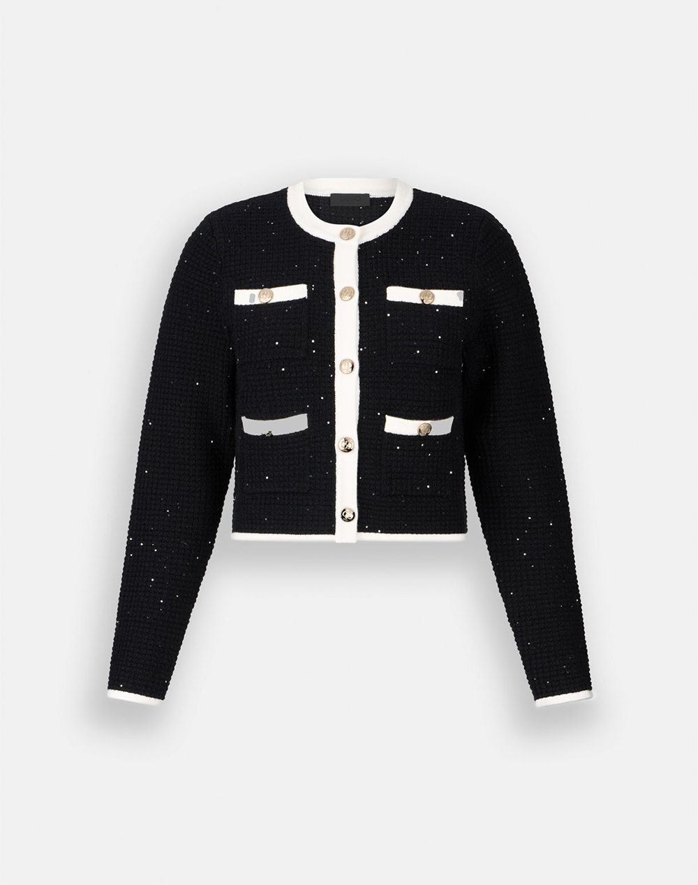 Women's jacket, long sleeves, with round neckline, lurex thread in the weave and contrasting details. (Composition: 36% Viscose, 29% Polyester, 19% Acrylic, 16% Nylon)