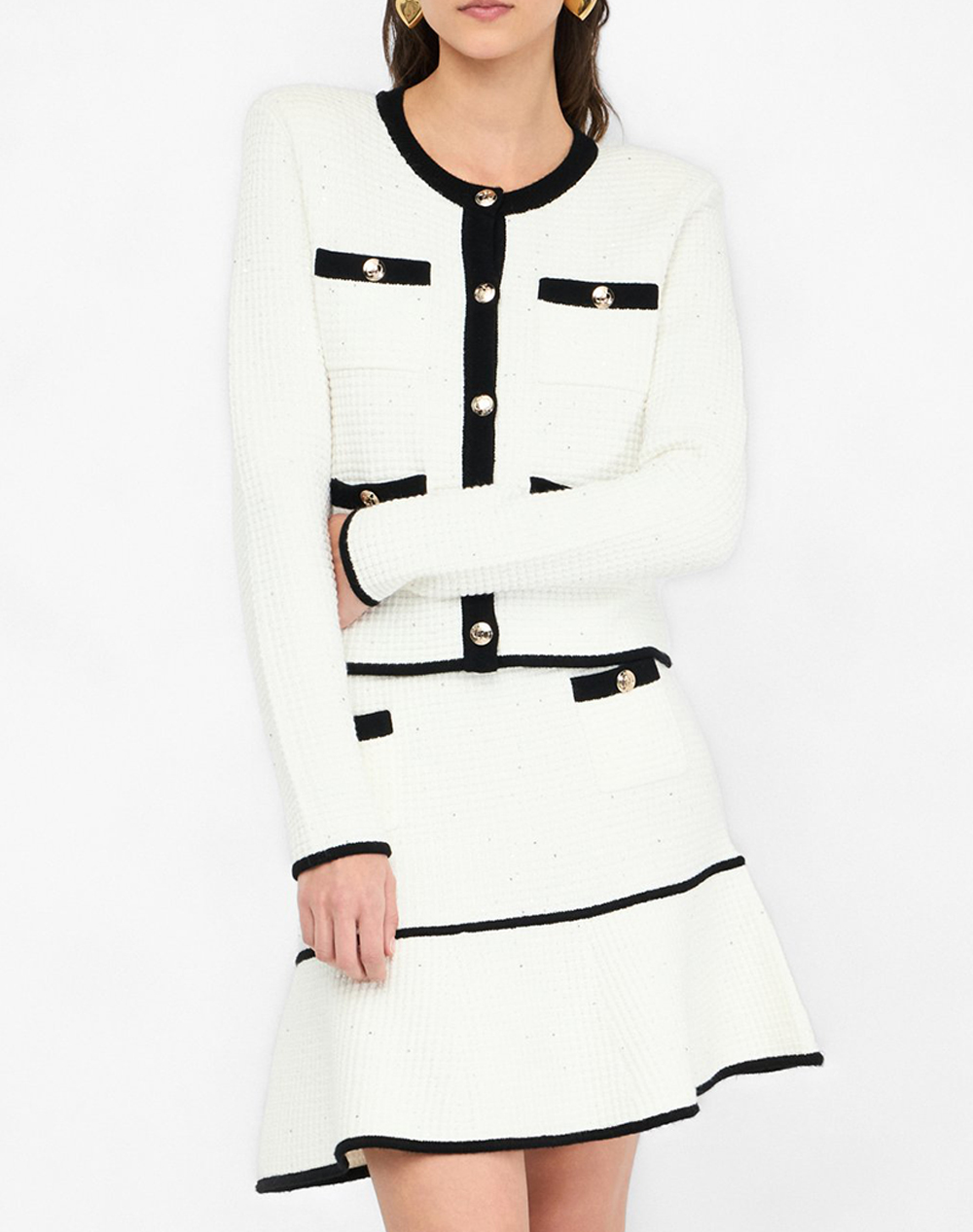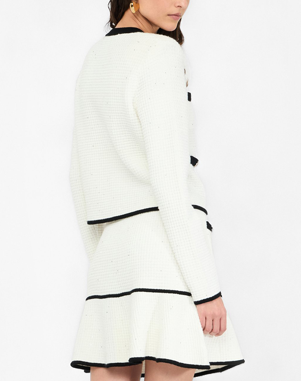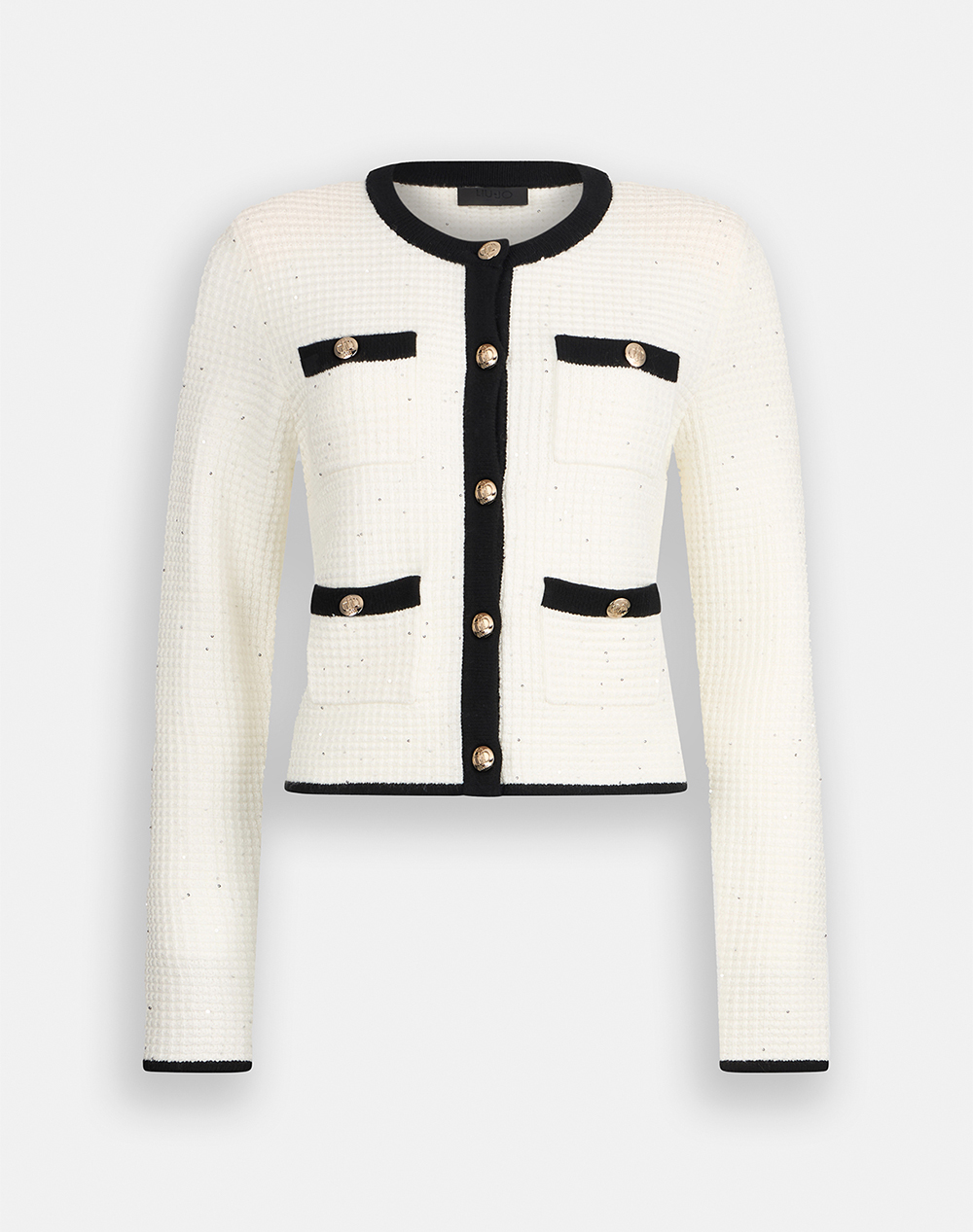 Women's jacket, long sleeves, with round neckline, lurex thread in the weave and contrasting details. (Composition: 36% Viscose, 29% Polyester, 19% Acrylic, 16% Nylon)