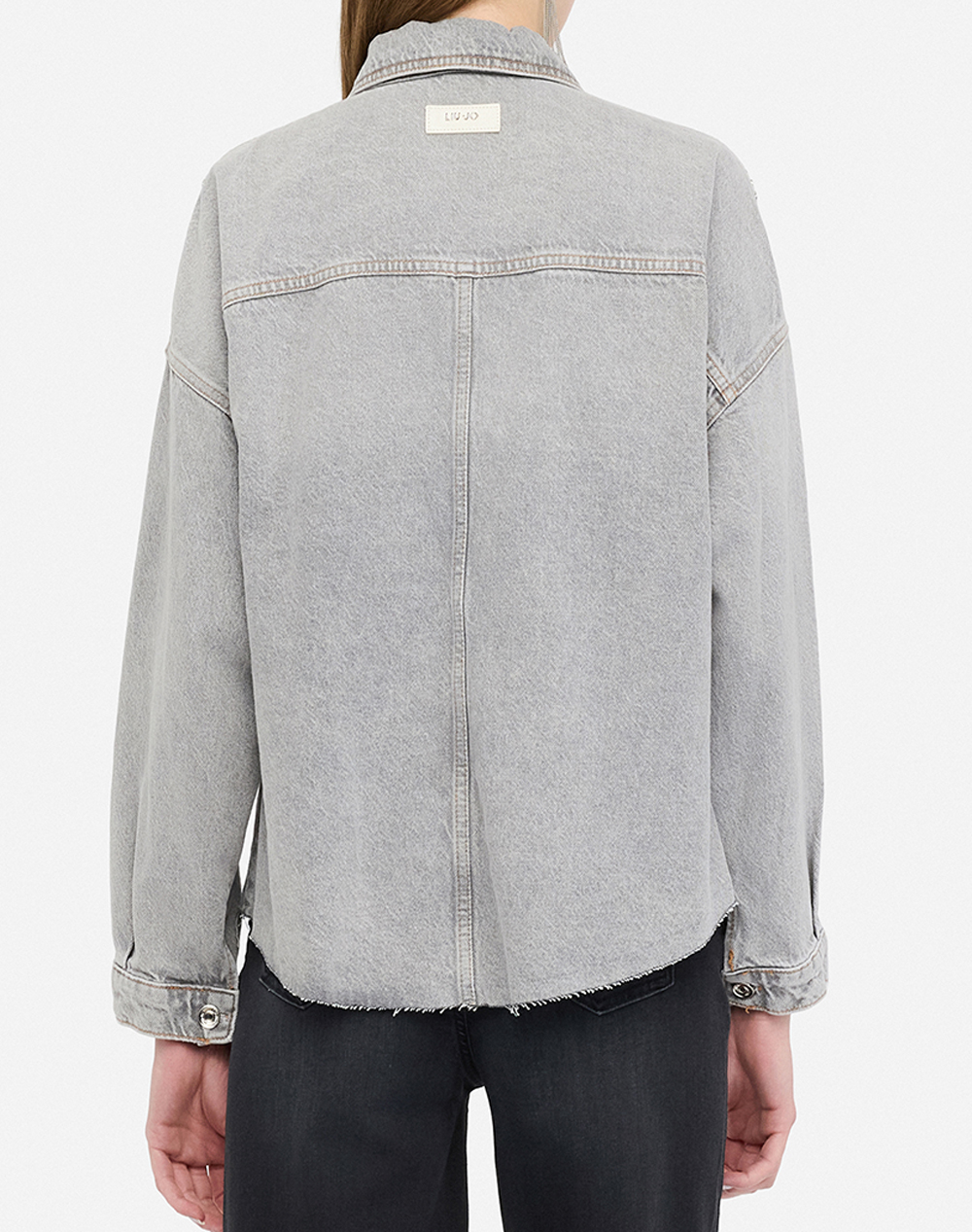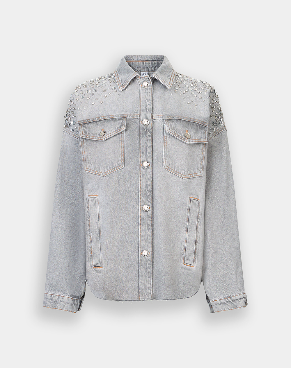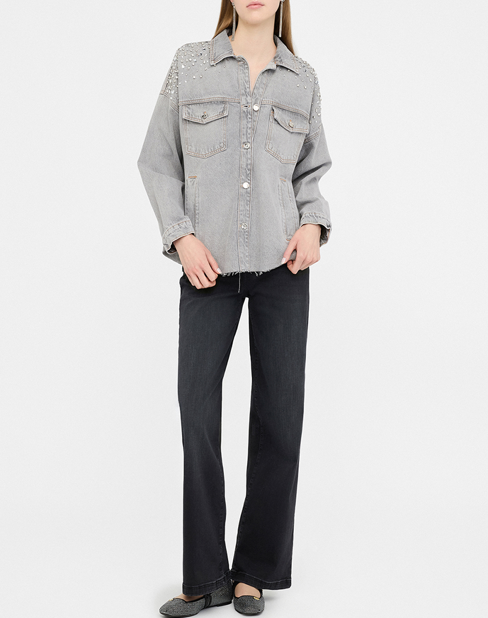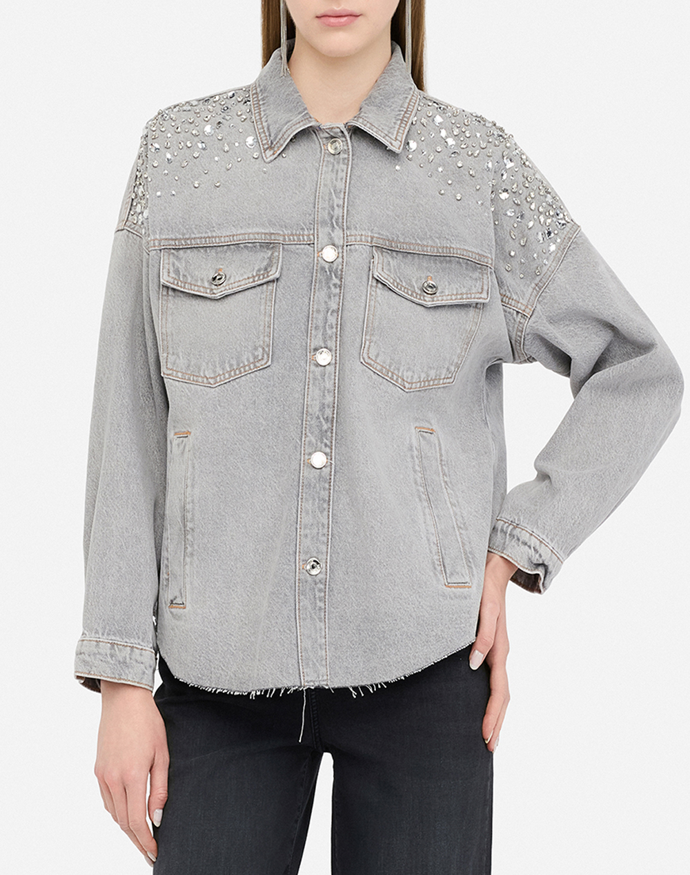 Women's jean jacket/overshirt, in a comfortable fit, with a collar, two chest pockets with a button and two side pockets. It features rhinestone details and ruffles at the hem. It closes with buttons at the front. (Composition: 100% Cotton)