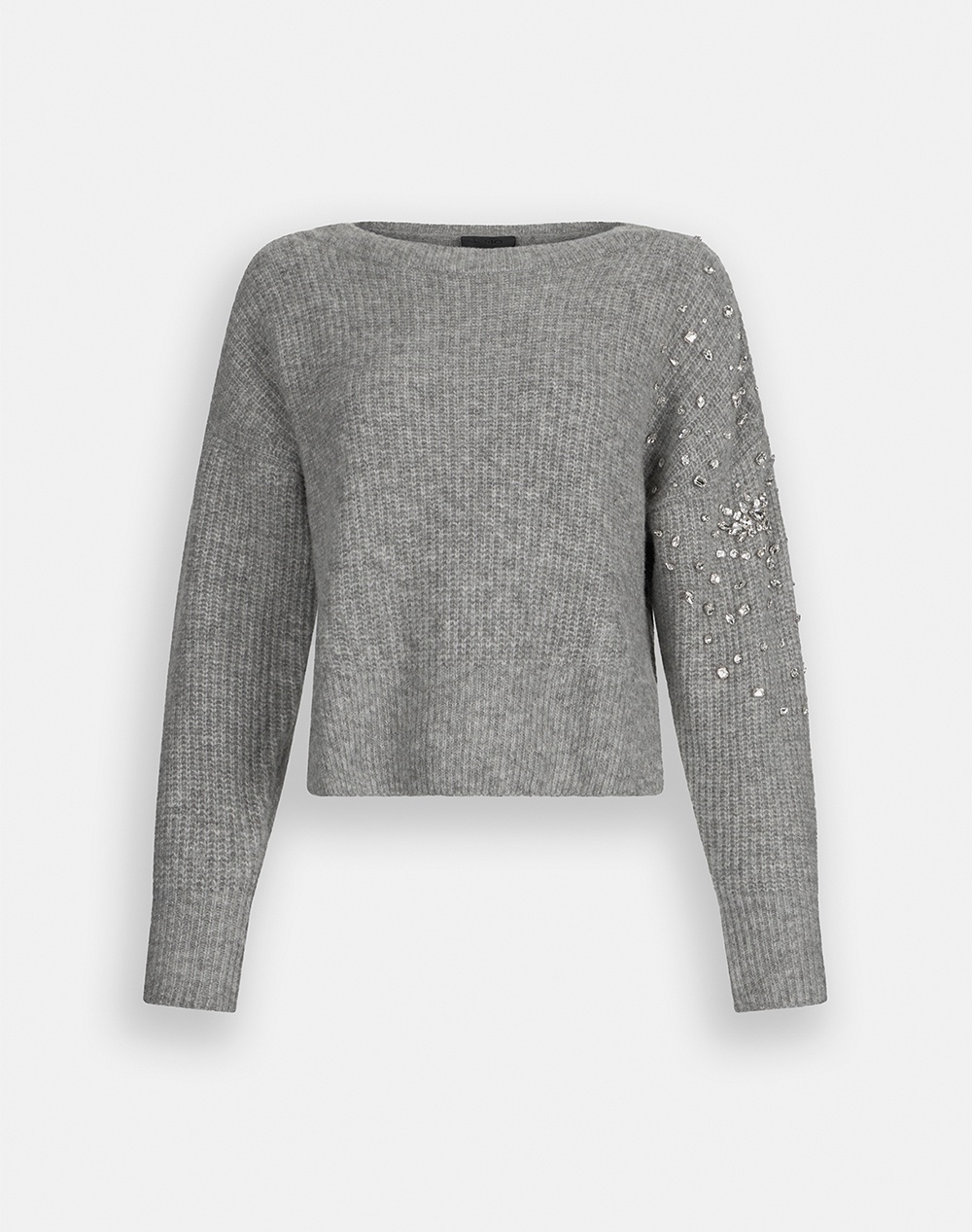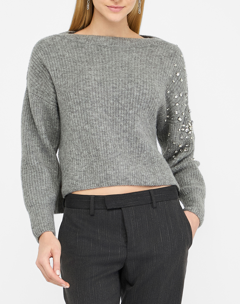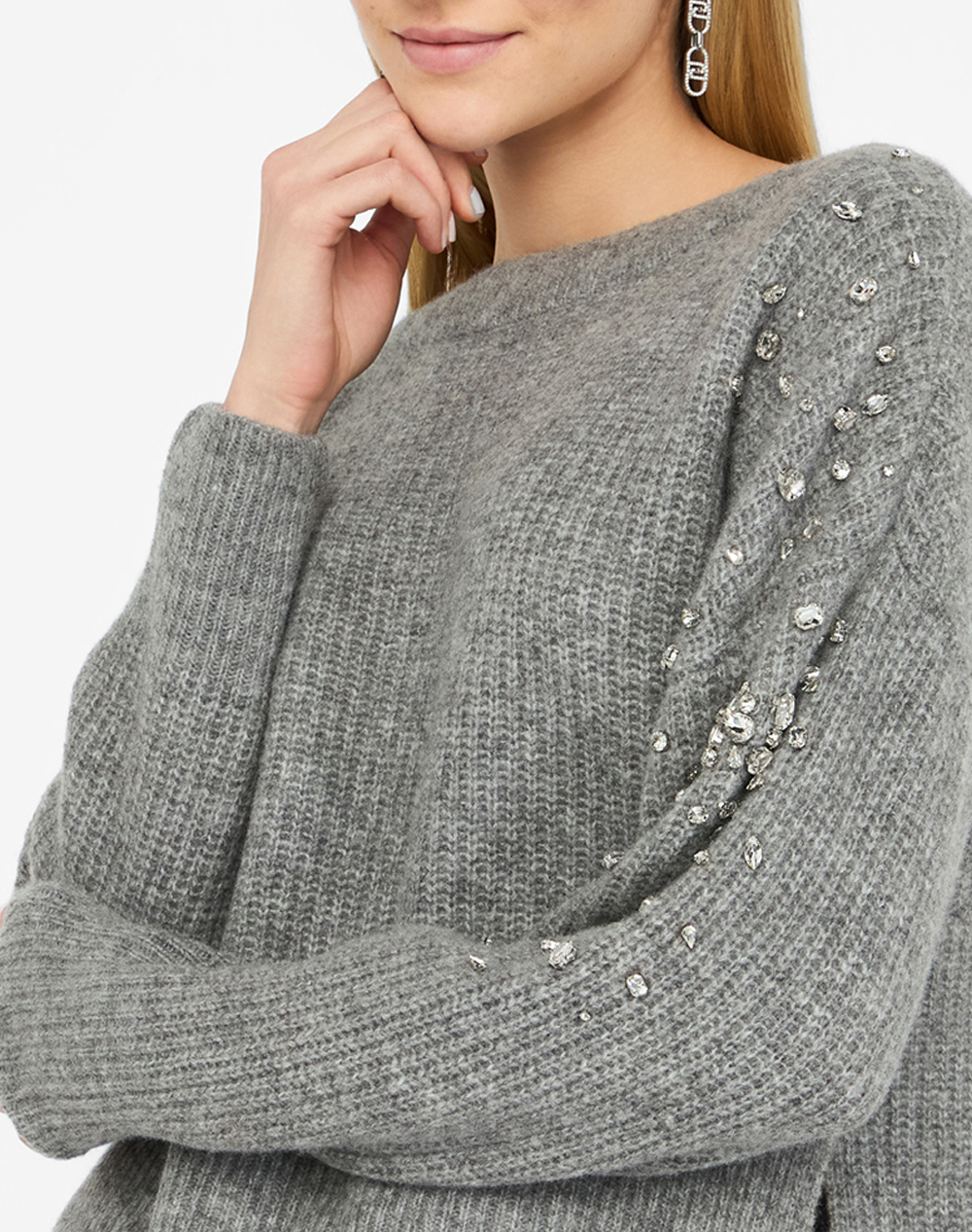 Women's knitted top, long-sleeved, with rib weave, strass details on one sleeve, side openings and boat neckline. (Composition: 37% Nylon, 35% Wool, 22% Acrylic, 6% Elastane)