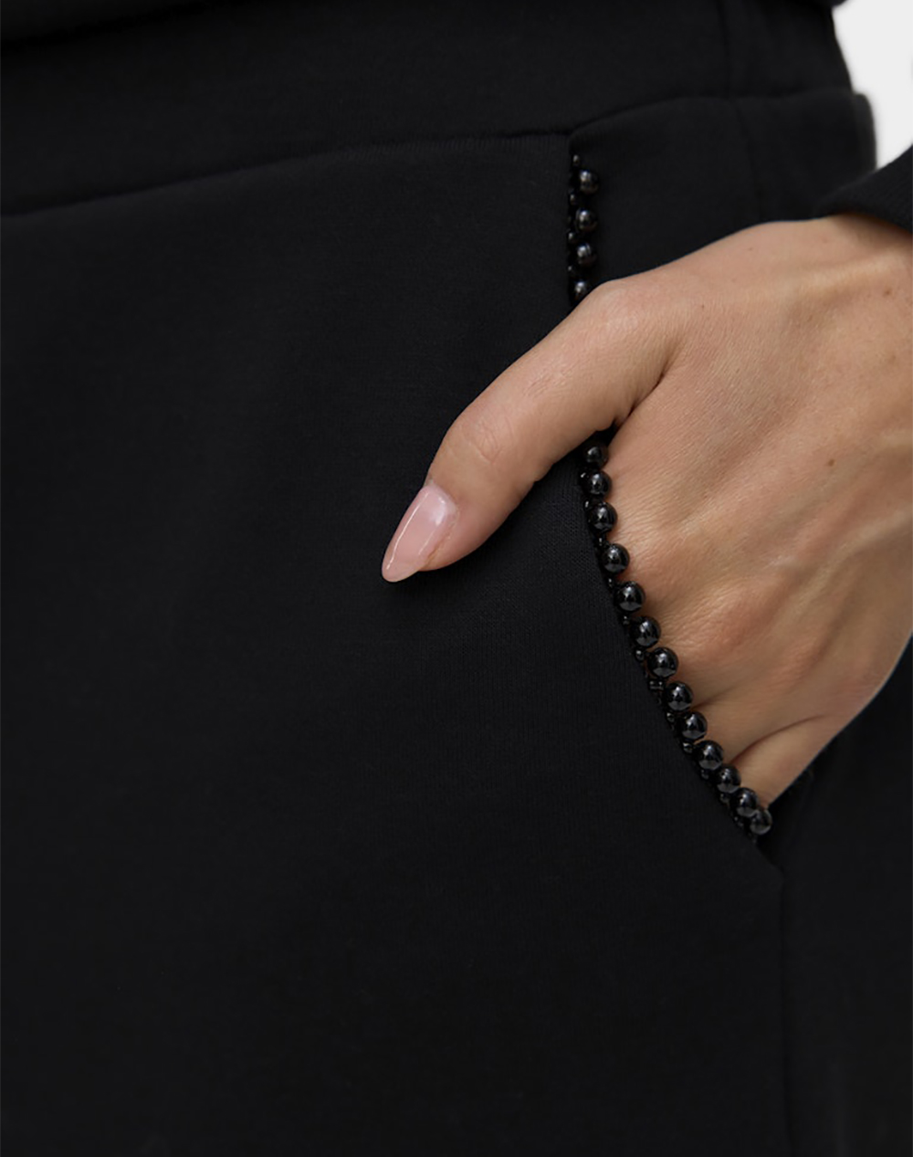 Women's wide-leg pants with side pockets and decorative pearl details. (Composition: 5% Recycled Polyester, 35% Cotton)